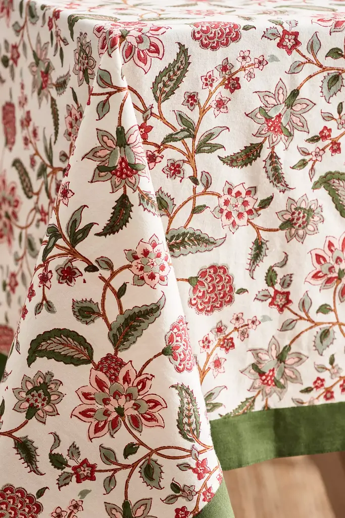 Block printed by hand, this practical cotton tablecloth is topped with an intricate botanical pattern.