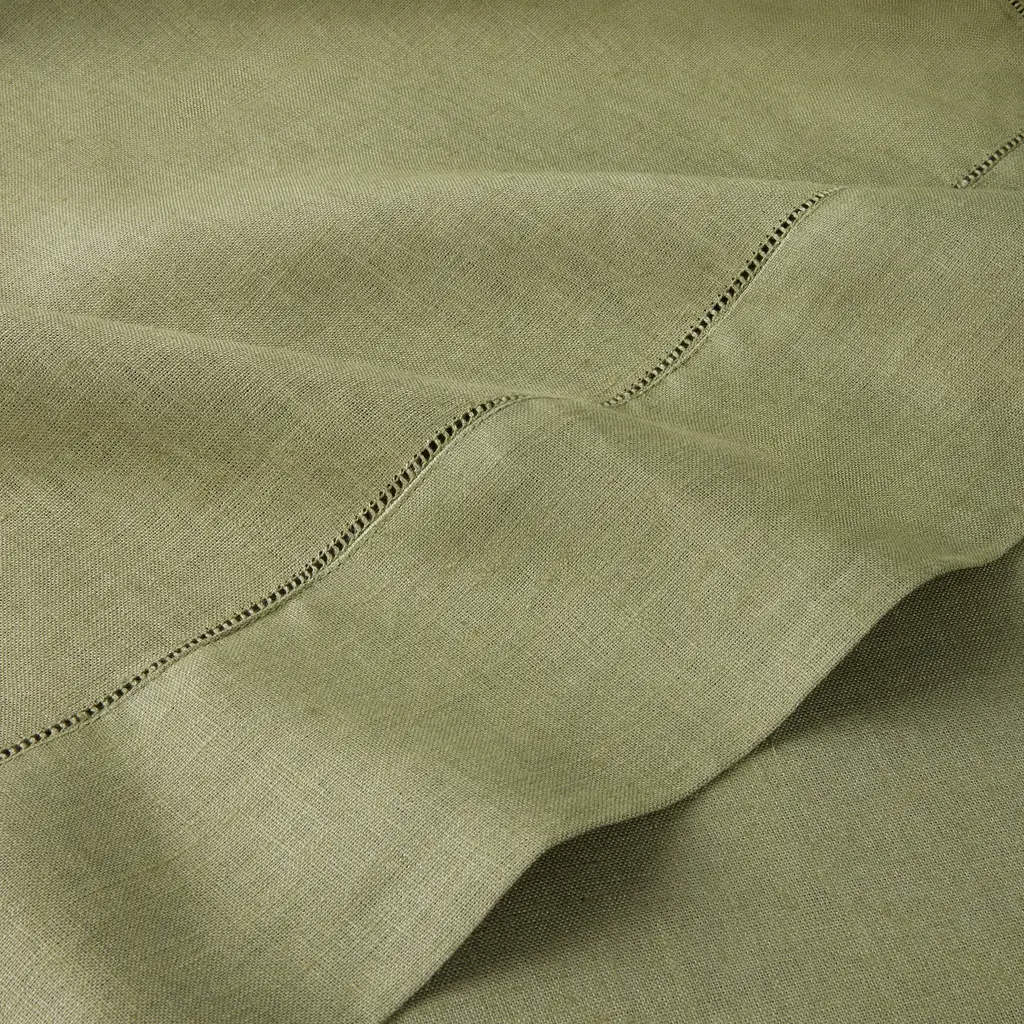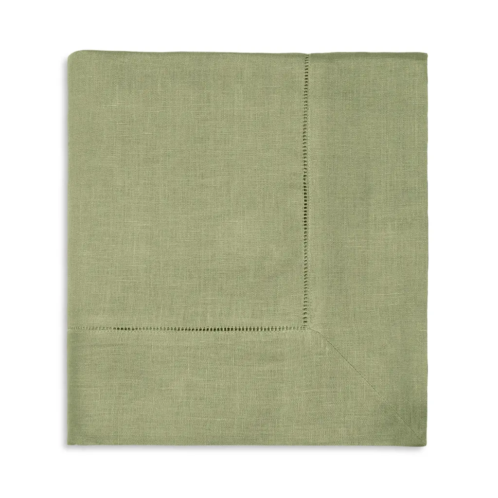 Beautiful tablecloth linens in bold solid colors, with a row of hemstitching detail for an elegant dining table.