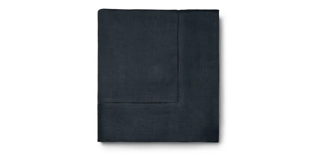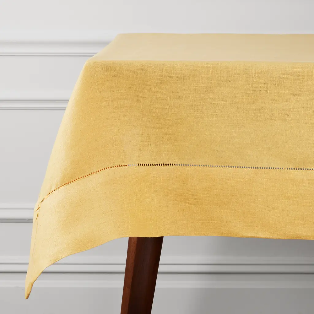 Beautiful tablecloth linens in bold solid colors, with a row of hemstitching detail for an elegant dining table.