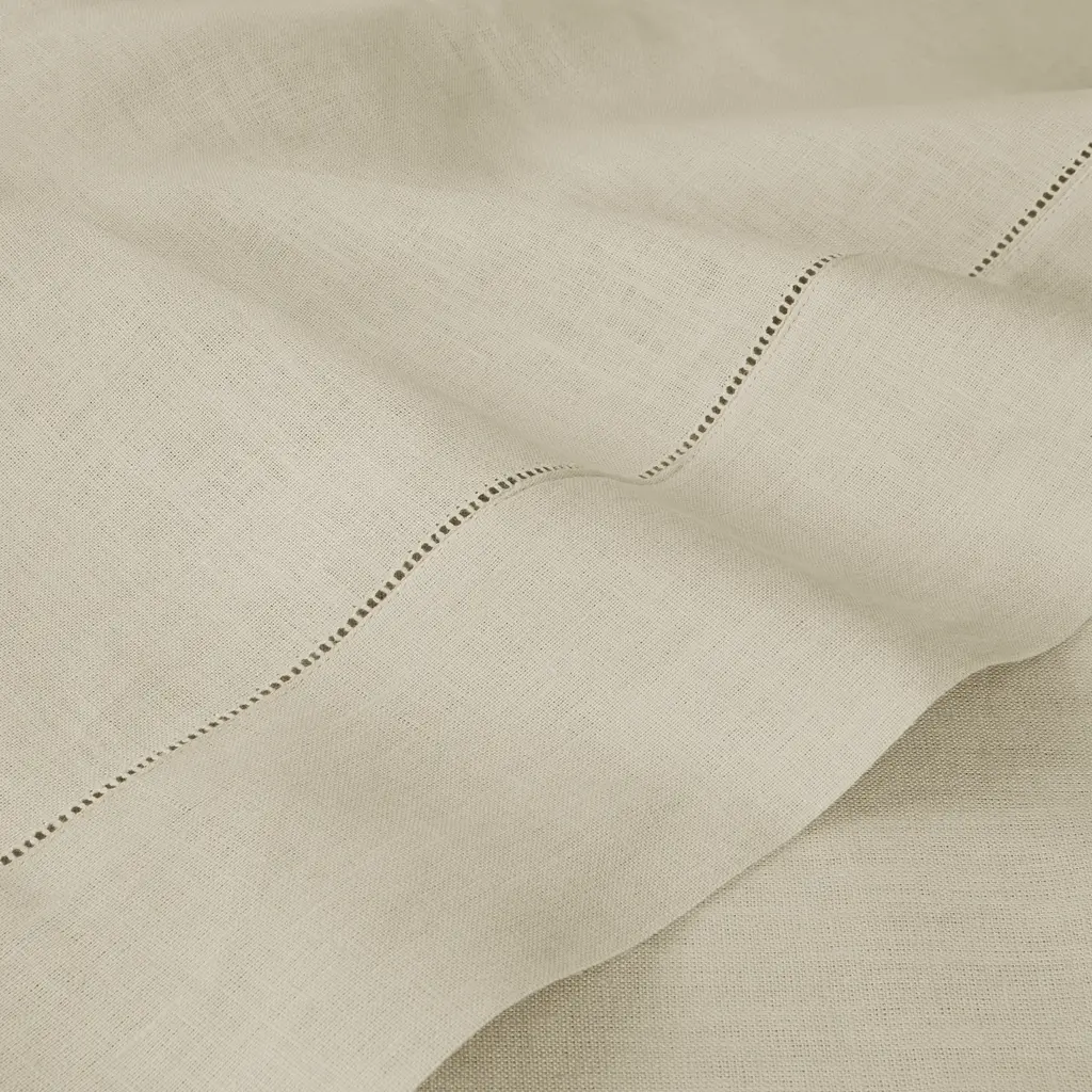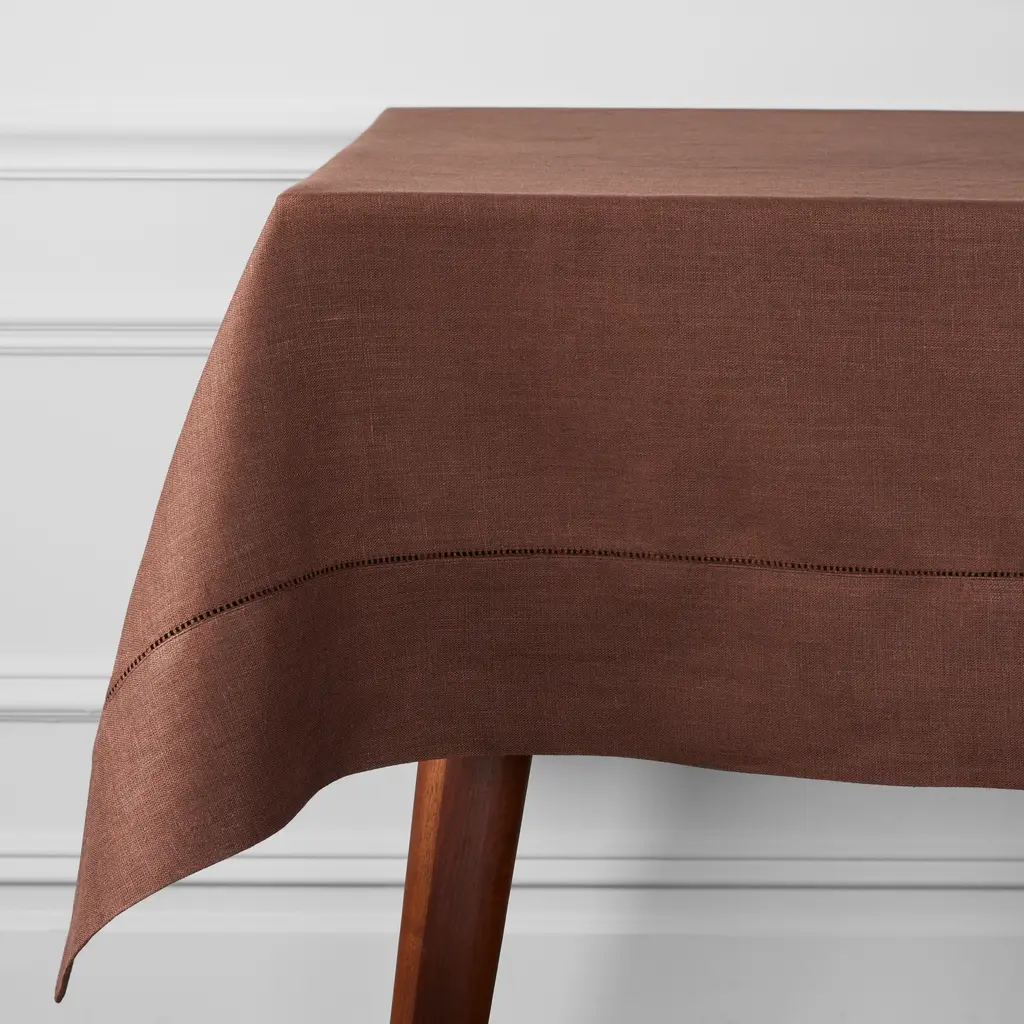 Beautiful tablecloth linens in bold solid colors, with a row of hemstitching detail for an elegant dining table.