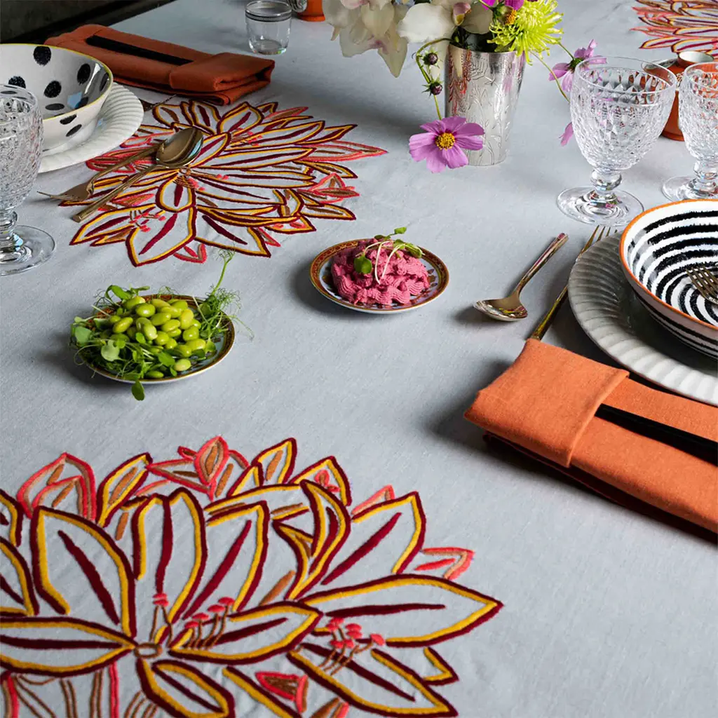 Hand-embroidered with open hems, our linen tablecloths provide the perfect backdrop for anysetting. With each motif taking fourteen hours to complete, and each meter of open hem two hours toprepare, the artistry behind each design is significant. Style with contrasting-coloured ceramics anddelicate floral arrangements for a chic, maximalist aesthetic.Through intricate detailing and unexpected colour combinations, the organic beauty of its floral motifs stands out, creating exquisite moments across the surface. Connecting us back to the wonder of nature itself, this collection adds charm and style to every table setting on which it is placed.