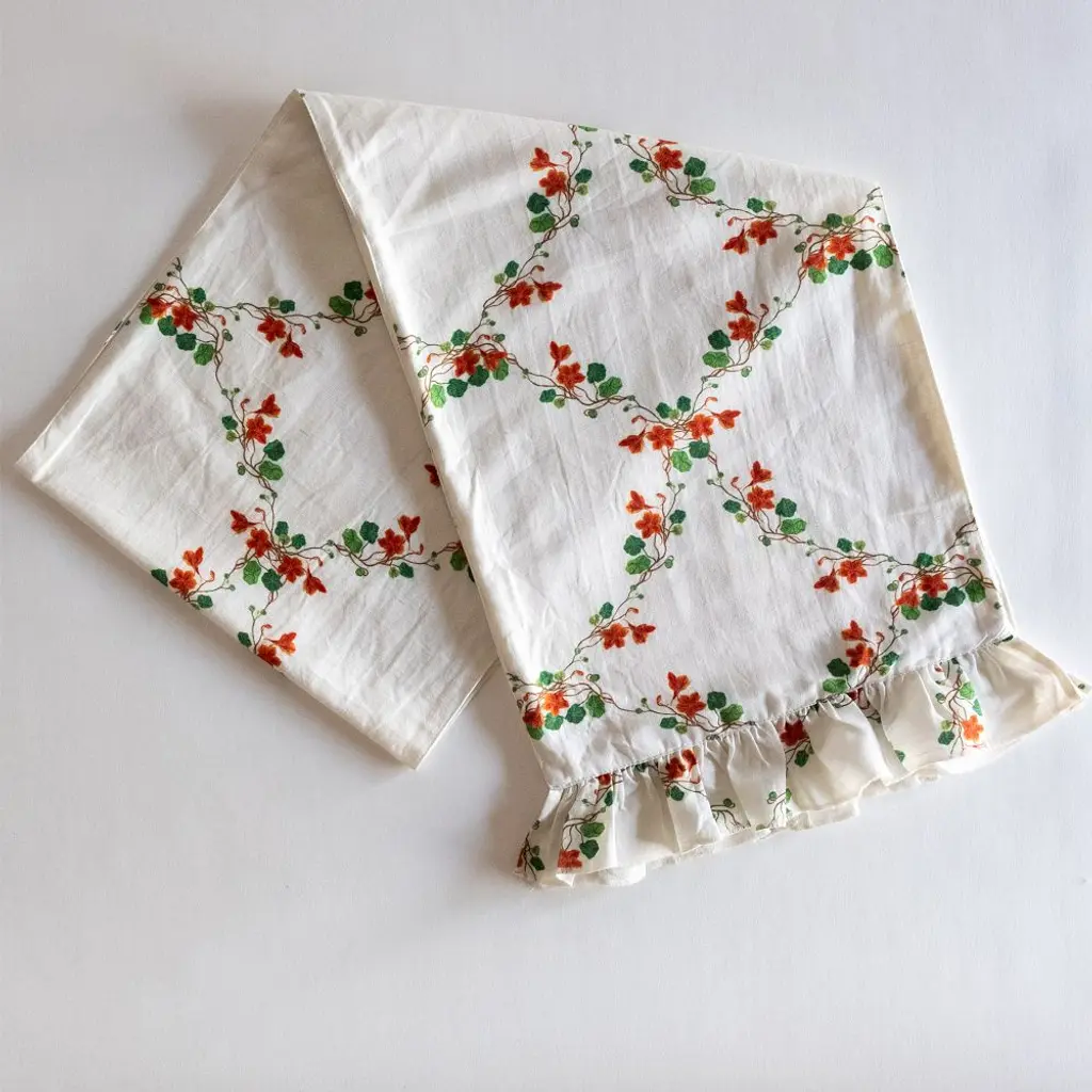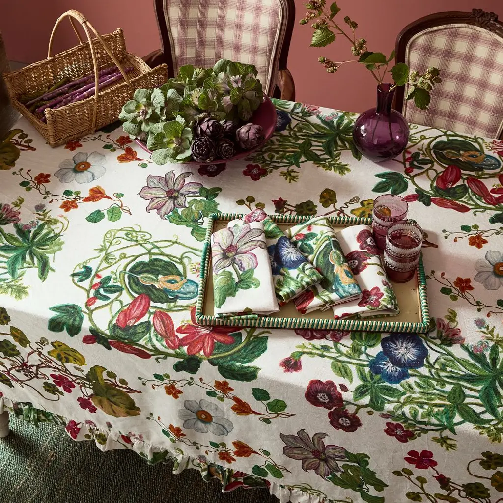 Ruffle-trimmed linens. Pretty prints. Conjure memories of gatherings past with our OEKO TEX® certified table linens. Just add vintage candlesticks.