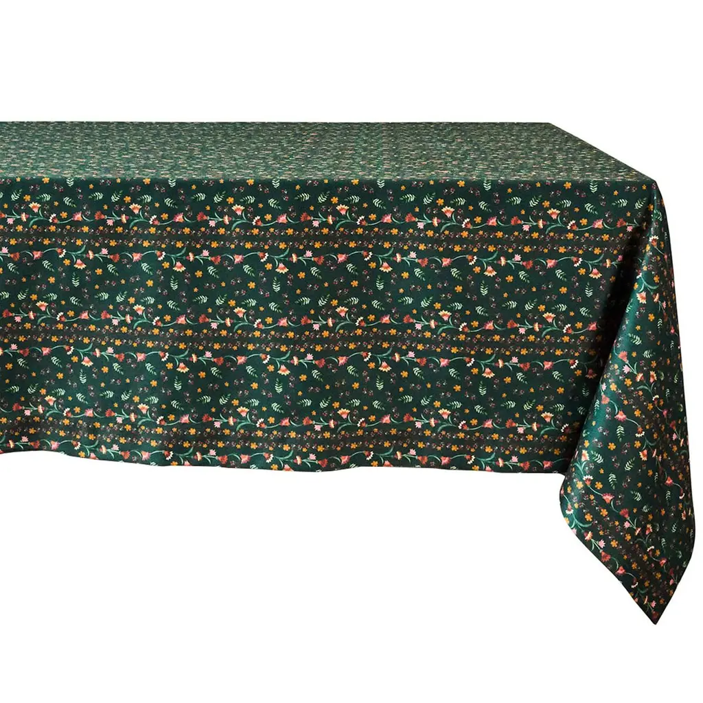 This tablecloth was inspired by charming Alpine chalets—as cozy as they are sweetly elegant—with colorful mountain wildflowers upon a deep, evergreen background.