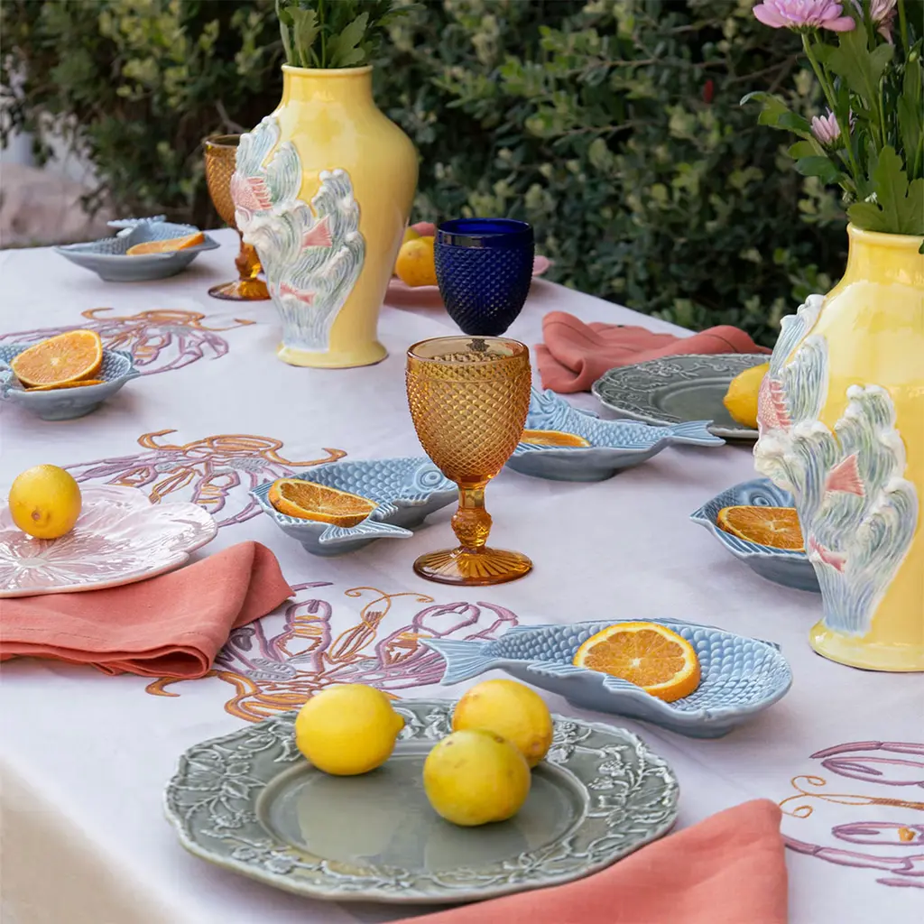 Hand-embroidered with open hems, our linen tablecloths provide the perfect backdrop for any setting. With each motif taking fourteen hours to complete, and each meter of open hem two hours to prepare, the artistry behind each design is significant. Style with contrasting-coloured ceramics and delicate floral arrangements for a chic, maximalist aesthetic.Native to the country’s coastal areas, Lobsters are the symbol of this collection, depicted using a variety of colour combinations across the five shades presented. Using embroidered lines, the motifs draw us back to the vivid and eye-catching beauty of the creature itself.