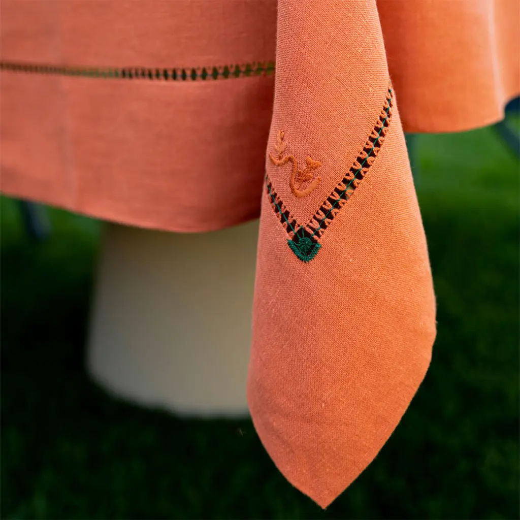 Hand-embroidered with open hems, our linen tablecloths provide the perfect backdrop for anysetting. With each motif taking fourteen hours to complete, and each meter of open hem two hours toprepare, the artistry behind each design is significant. Style with contrasting-coloured ceramics anddelicate floral arrangements for a chic, maximalist aesthetic.Native to the country’s coastal areas, Lobsters are the symbol of this collection, depicted using a variety of colour combinations across the five shades presented. Using embroidered lines, the motifs draw us back to the vivid and eye-catching beauty of the creature itself.