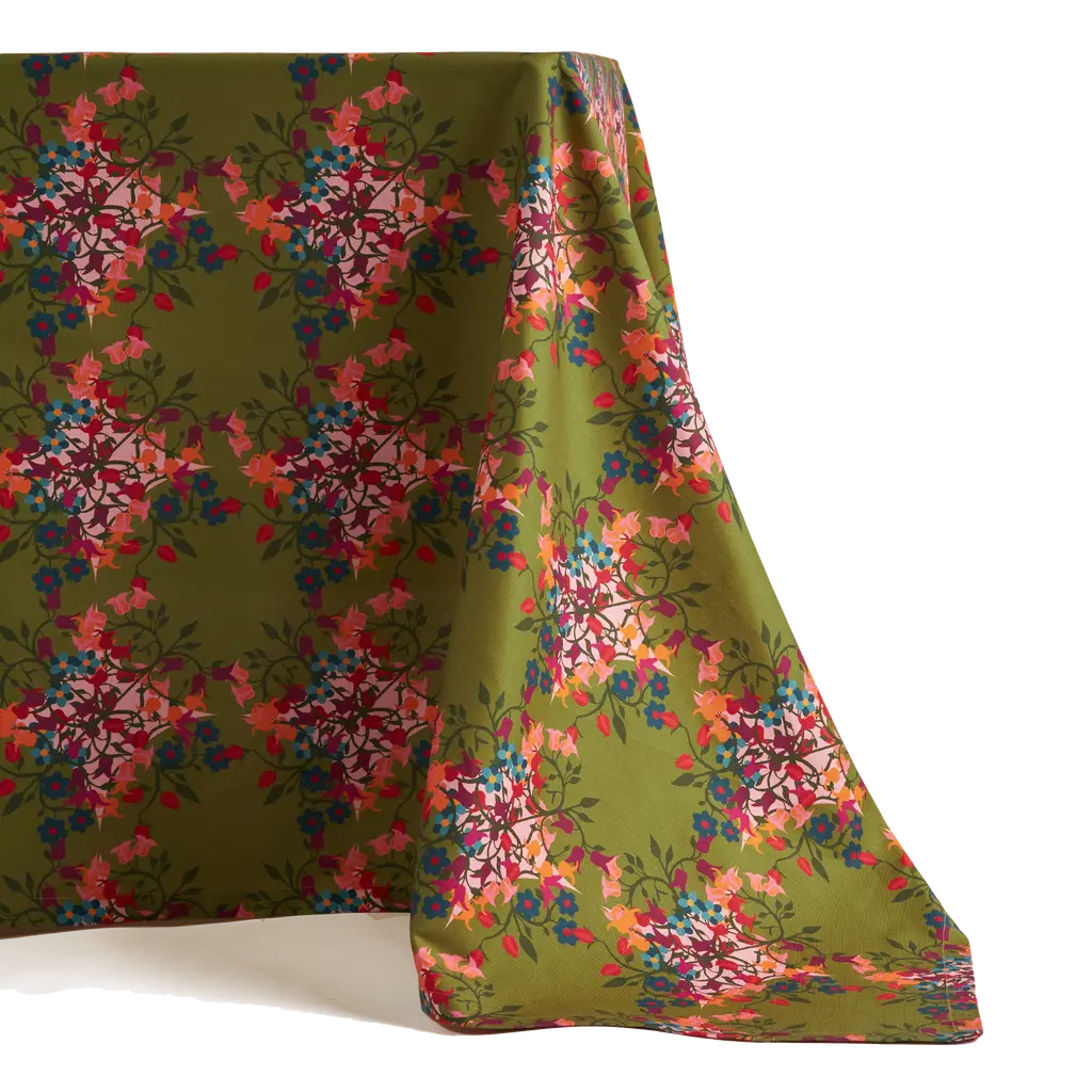 An extra large rectangular tablecloth in golden orange and deep fuchsia with a bold floral print. Called Blumen Orange, this tablecloth is elegant and unique and adds an extra oomph to any space. Use this for an elegant dinner table or a sunny summer outdoor barbecue.Works great with the placemats and napkins from the Blumen collection. Two colorways available; get them in moss green with a stunning contrasting baby pink or in orange with vibrant fuchsia.Made from 100% Organic Cotton and printed with low impact dyes.Square 100" / 250cm. Great for large square or a round table that sits 6 - 8 people.Need a different size? Check out sizes Large and Small.