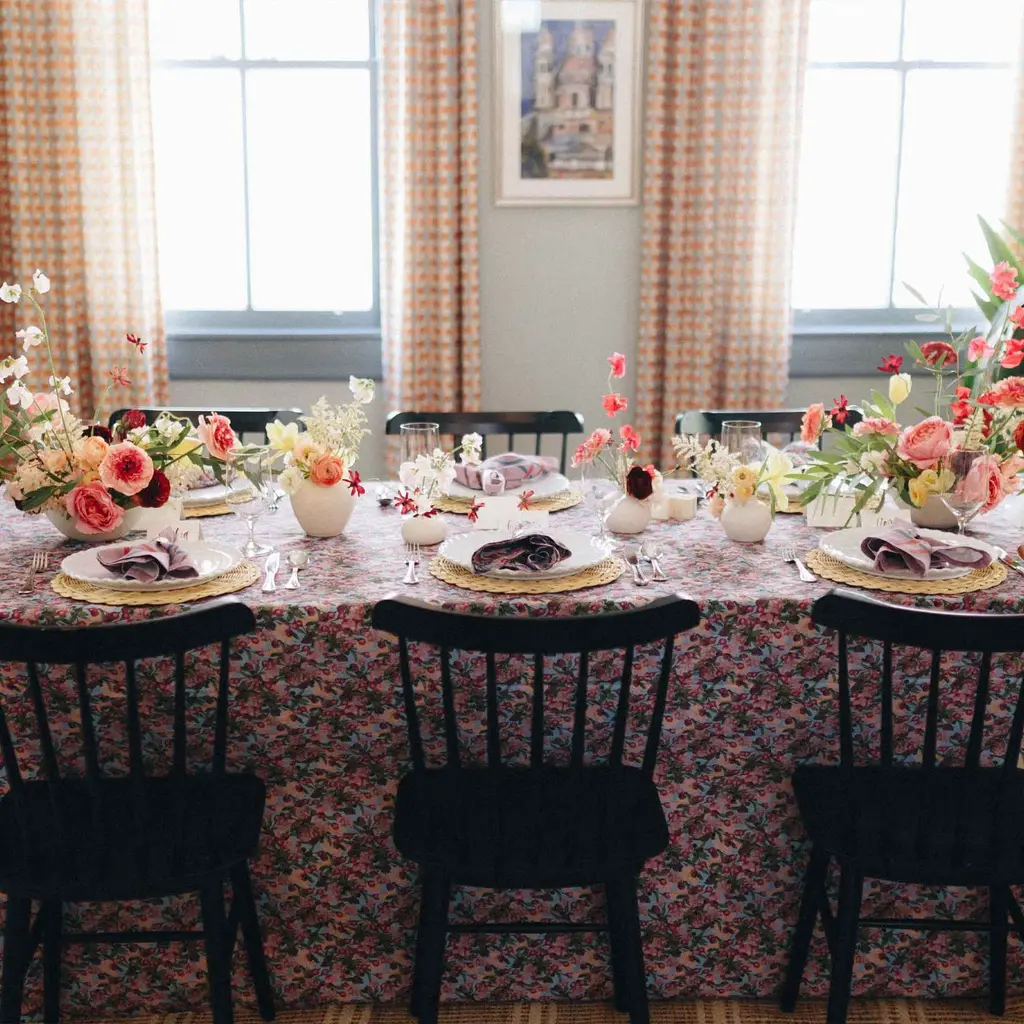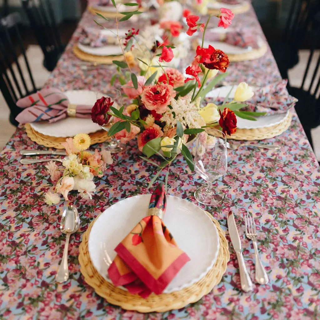 A square Tablecloth in our romantic and indulgent cherry blossom print on a blue background. We call it Romance is Dead - but is it? Looks lovely for any occasion, be it a dinner party with girlfriends or an outdoor brunch.Digitally printed on heavy organic cotton. Don't forget to check out the matching round placemats and napkins to complete your unique collection. Or check out its sister in yellow.Square 100" / 250cm. Great for large square or a round table that sits 6 - 8 people.Need a different size? Check out sizes Large and Small.