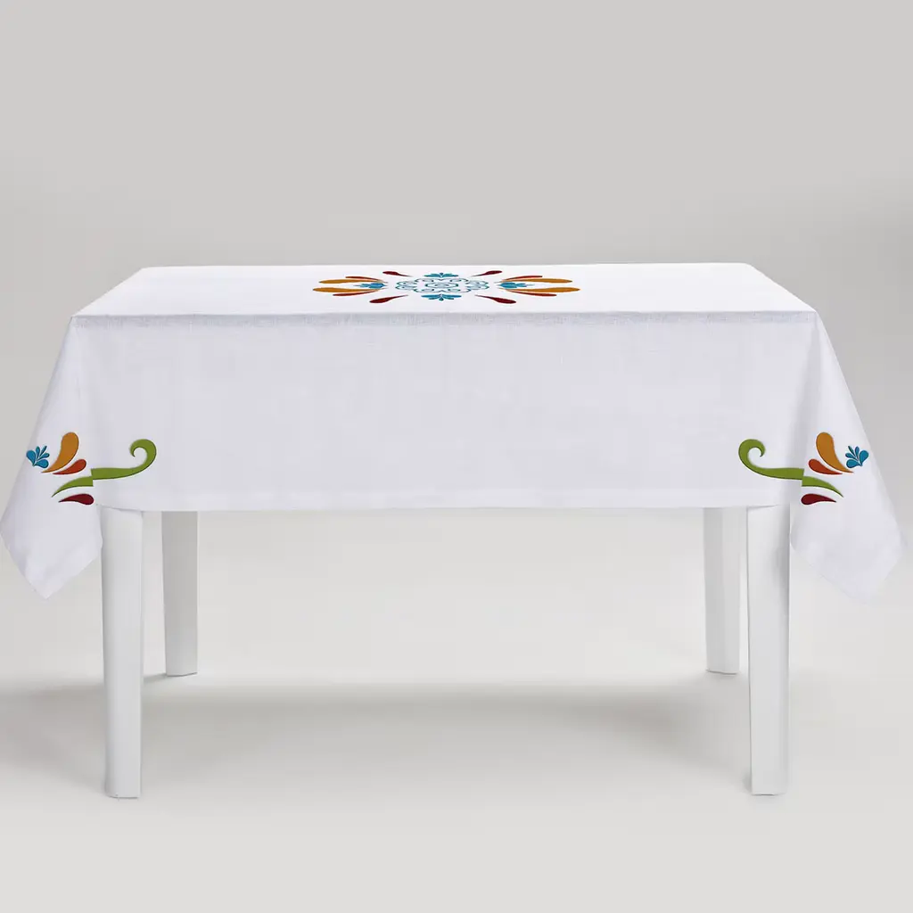 Colorful hand-decorated majolicas - typical of the Amalfi Coast - are the inspiration behind the minute manual embroideries decorating this precious Masters of Linen-certified white linen tablecloth. Fine Mako cotton in vibrant hues is skillfully combined by artisans who painstakingly attend to every detail during the hours-long embroidery process. Ideally combined with its napkins counterparts that can be found in the Artemest catalog.