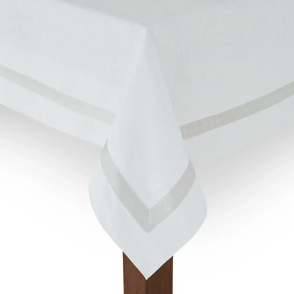Bring a refined touch of laid-back luxury to your dining table. Our fresh, white linen tablecloth features a handsome two-toned embroidered border design running along its edges. Each piece is entirely handmade by an artisan. The linen used is rich in natural texture and has been pre-washed for exceptional softness and comfort, akin to your favorite linen shirt.