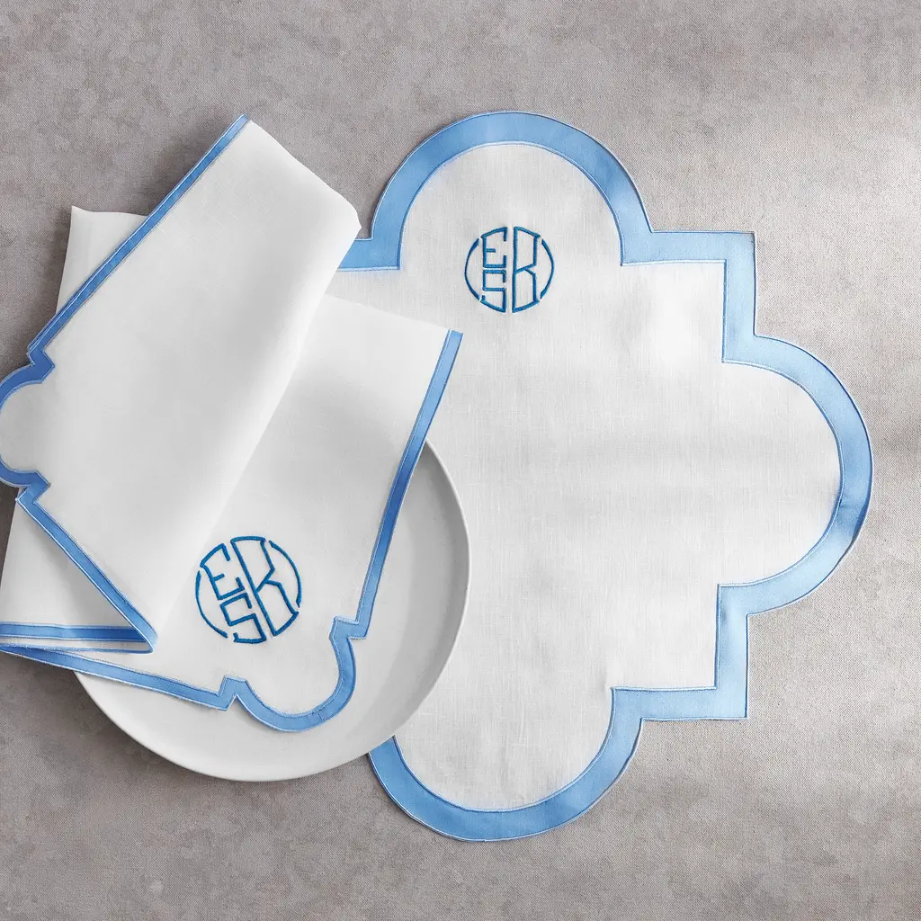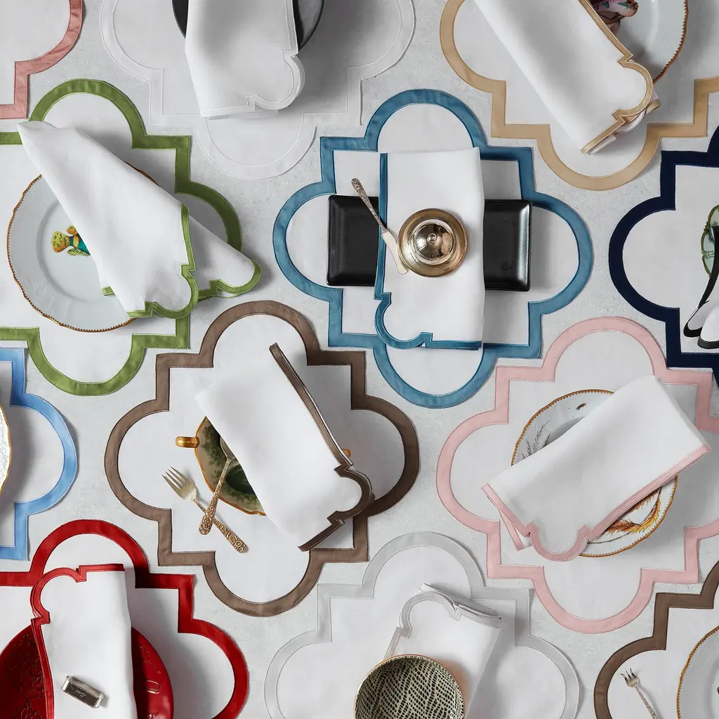 Inspired by walking on Worth Avenue in Palm Beach, Matouk's Mirasol table linens features the arch trim of shop awnings making the set a must-have for all occasions.