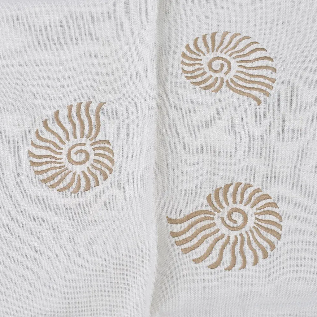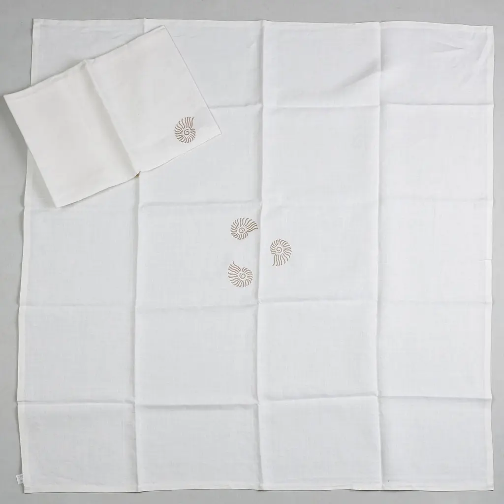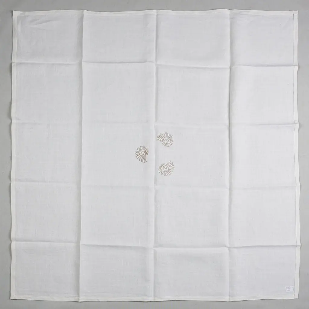 Pair of small square linen table cloths named "Sea view tablecloth", with écru shell embroidery.Placed diagonally, placed close together, they can cover a long table.
