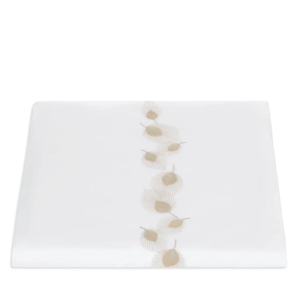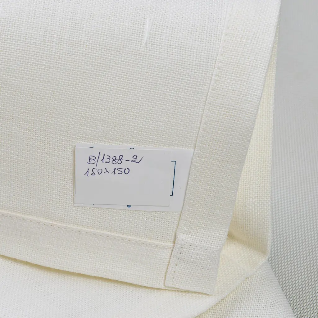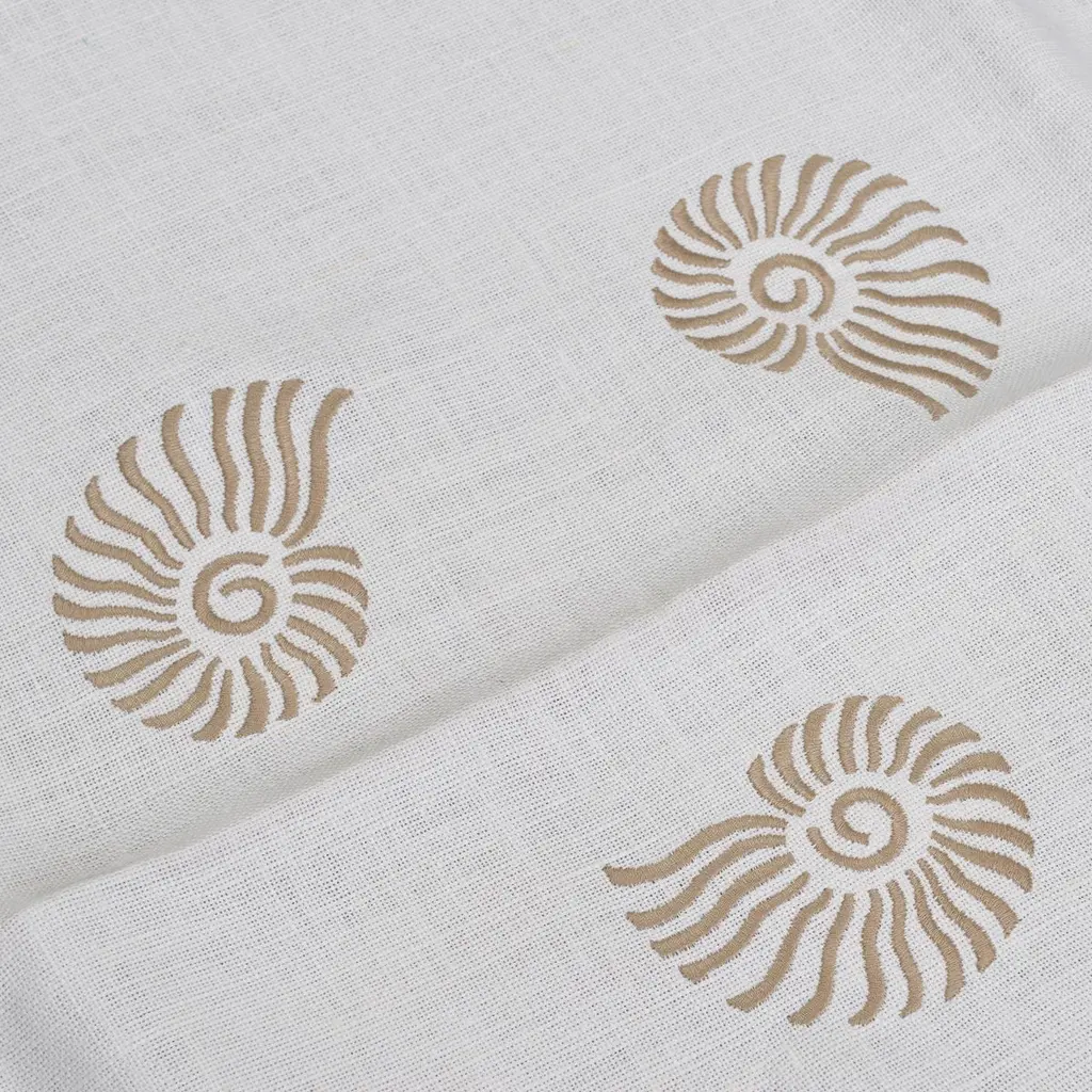 Pair of small square linen table cloths named "Sea view tablecloth", with écru shell embroidery.Placed diagonally, placed close together, they can cover a long table.
