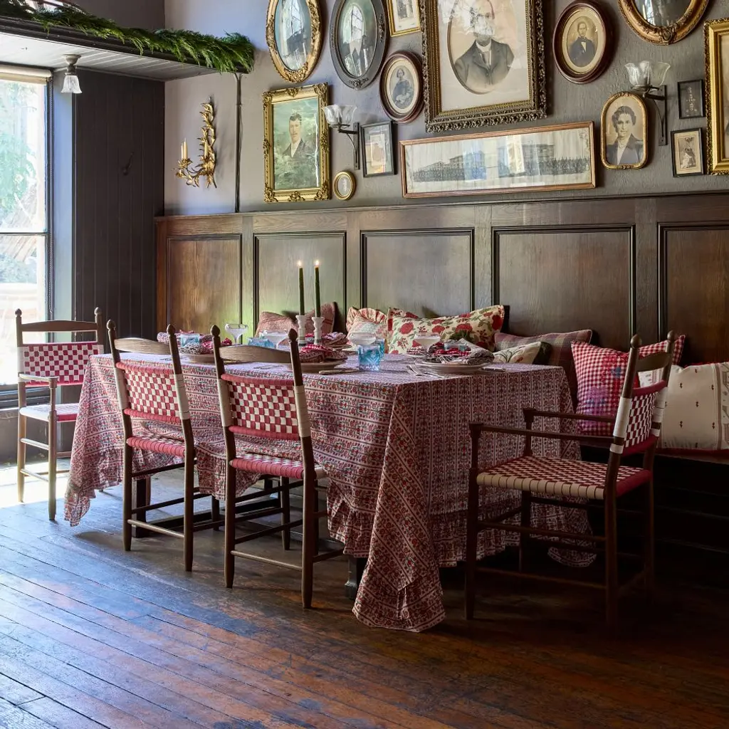 Folkloric find. In an intricate floral weave with a ruffled edge, this OEKO-TEX® certified linen/cotton tablecloth brings heritage craft to holidays and every day.