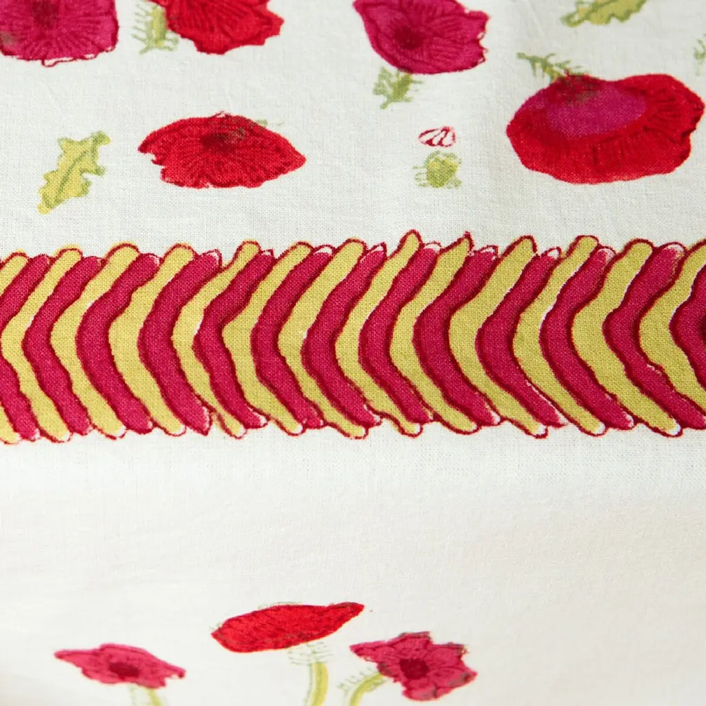 Elegant yet vibrant, the Poppies collection foregrounds the delicate leaves and bold color of an iconic perennial plant. Whether an addition to a terrace table or dining room, this French linen provides an easy way to brighten up a meal. Each of these linens has been carefully handprinted by skilled artisans using a time-honored technique, resulting in a singular piece of craftsmanship.