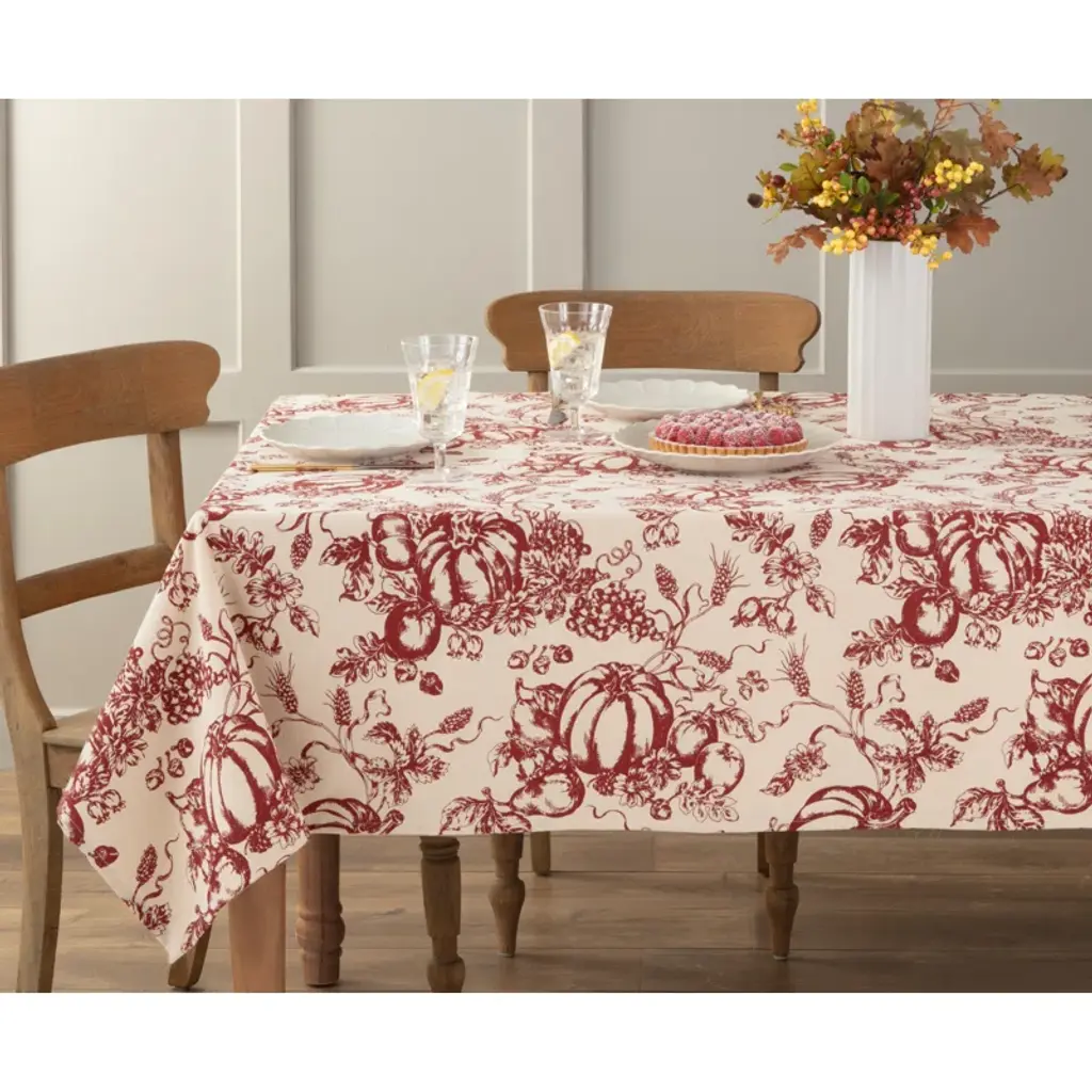 Bring the beauty of autumn's bounty to your home with the Pumpkin Harvest Vine Tablecloth. Featuring detailed print design of orange pumpkins, green vines, fall flowers, and a sage double border over white ground with graceful floating leaves throughout, this tablecloth is sure to create a warm and inviting atmosphere for any occasion. Excellent for Thanksgiving dinner, events, parties, family gatherings and everyday use throughout the fall season. Soft and durable fabric can be ironed to release stubborn creases and keep your tablecloth wrinkle free. Hemmed edges add a finished look and prevent wear and tear. Available in a large selection of table shapes and sizes including square, rectangle, oval and round, you are sure to find the perfect fit for all of your entertaining needs. 100% Polyester. Easy care, machine washable. Coordinate to the Pumpkin Harvest Vine napkin set to complete the look.