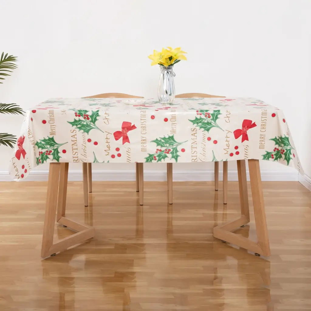 The perfect way to add a touch of holiday cheer to your home decor! Crafted with care and designed to make your holiday gatherings even more special, this tablecloth combines functionality with festive aesthetics.• Flannel backing can improve slip resistance and softly protect the table surface• Water-proof, oil-resistant, and easy to clean• Dimensions: 60 inches x 84 inches (0.92lb), 90 inches x 52 inches (0.85lb)Key Features:High-Quality Material: Our tablecloth is made from durable material, ensuring longevity and easy maintenance. It's not only water-resistant but also resistant to stains, making it a practical choice for your holiday festivities.Christmas Bow Accent: Elevate your holiday decor with the delightful addition of a Christmas Bow. Placed strategically on the tablecloth, it adds a whimsical and festive touch that captures the spirit of the season\asy to Clean: Accidents happen, especially during lively gatherings. With our tablecloth, cleanup is a breeze. Simply wipe away spills and stains with a damp cloth, and your tablecloth will look as good as new.Versatile Size Options: Available in various sizes to suit different table dimensions, ensuring a perfect fit for your dining or display table. Whether you're hosting a small family dinner or a larger holiday feast, we have the right size for you.Reusable and Eco-Friendly: Designed with sustainability in mind, our tablecloth is reusable, reducing waste and environmental impact. Enjoy the festive spirit year after year with a product that cares for both your home and the planet.Holiday Gift Option: Looking for a thoughtful holiday gift? Our tablecloth with Christmas Bow makes for a delightful present, adding a touch of festive joy to any home.Classic Design: The timeless design of our tablecloth complements various home decor styles, making it a versatile choice for the holiday season and beyond.Make this holiday season extra special with our tablecloth featuring a charming Christmas Bow. Create lasting memories and a warm, inviting atmosphere for your loved ones. Order yours today and transform your home into a festive wonderland!