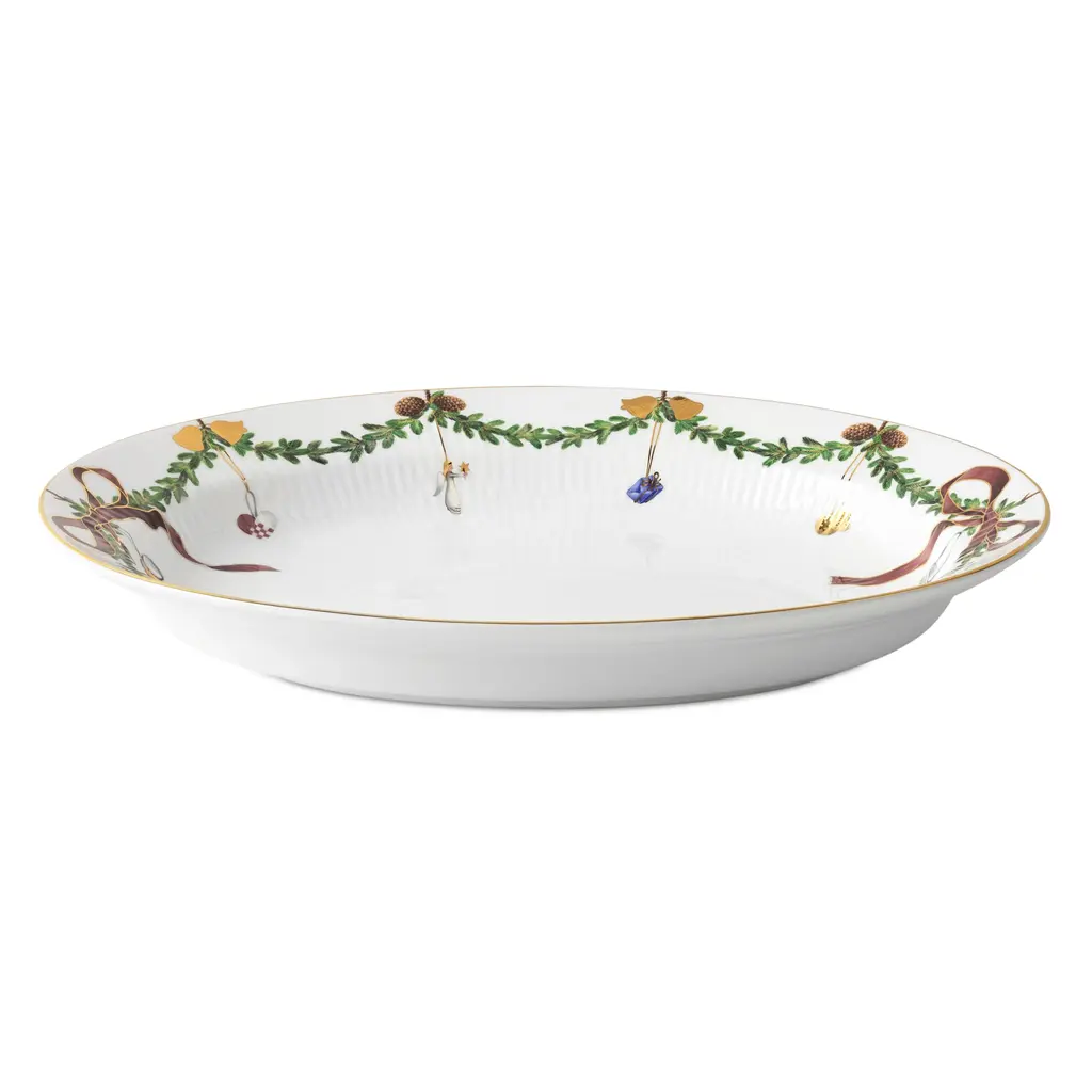 Royal Copenhagen's Star Fluted Bone China dinnerware was inspired by a service that was first produced in 1895. With its elegant wreaths of pine, red ribbon bows and gold accents, it's the perfect background to a joyous Christmas table setting. Setting a table and using the Christmas dinner service from Royal Copenhagen has its place among many Christmas traditions. The festive wreaths of spruce, bordering the plates, bowls and cups are adorned with silk-ribbon bows and Christmas decorations, creating a rich and elegant service that is the perfect background to a joyful Christmas meal. When the table is laid and the candles are lit, Christmas has come. Five piece place setting includes dinner plate, salad/dessert plate, bread & butter plate, teacup and saucer. Royal Copenhagen is a world famous brand producing exclusive, high-quality porcelain dinnerware, figurines, home decor items and collectibles that delight collectors and new generations of customers. Originally owned by the Danish Royal Family, they produced fine porcelain for the Queen of Denmark. In the trademark Danish colors of blue and white, Royal Copenhagen's designs have been handpainted and manufactured by ancient methods refined since 1775. They are well known for their Flora Danica and Blue Fluted collections, which are but part of a line of 135 dinnerware patterns.