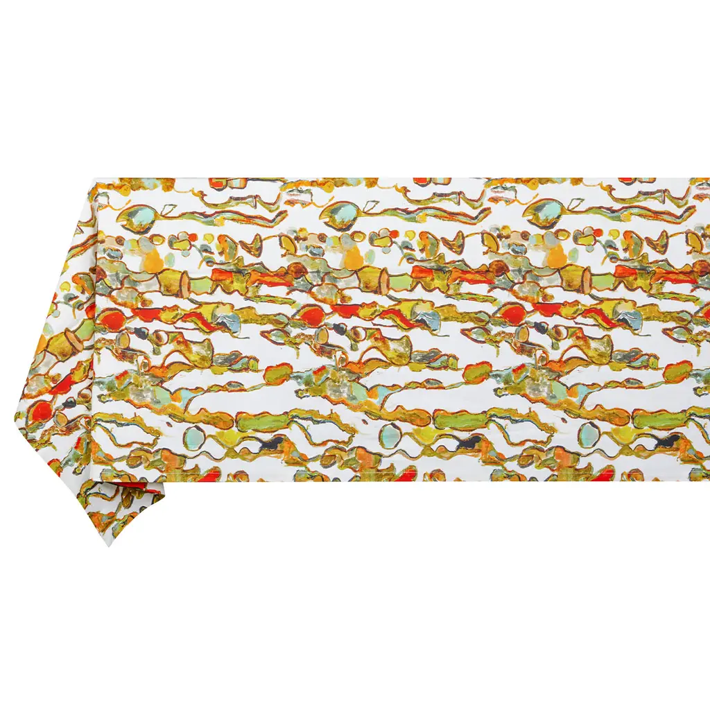 The Stromboli print 55% linen 45% cotton tablecloth is organic in feel and sophisticated in looks, hot and mediterranean in looks.