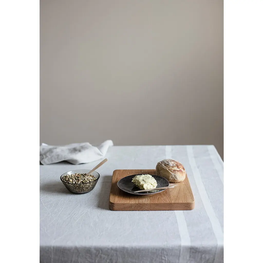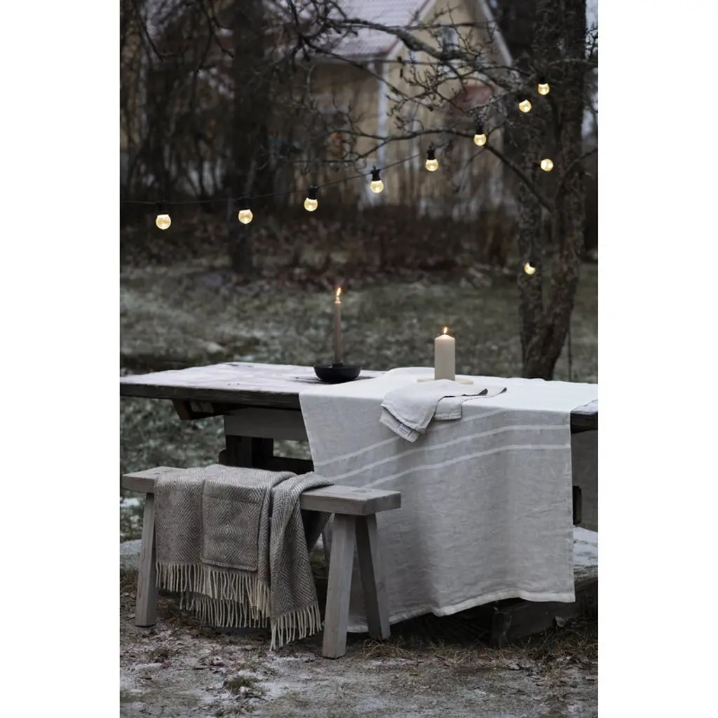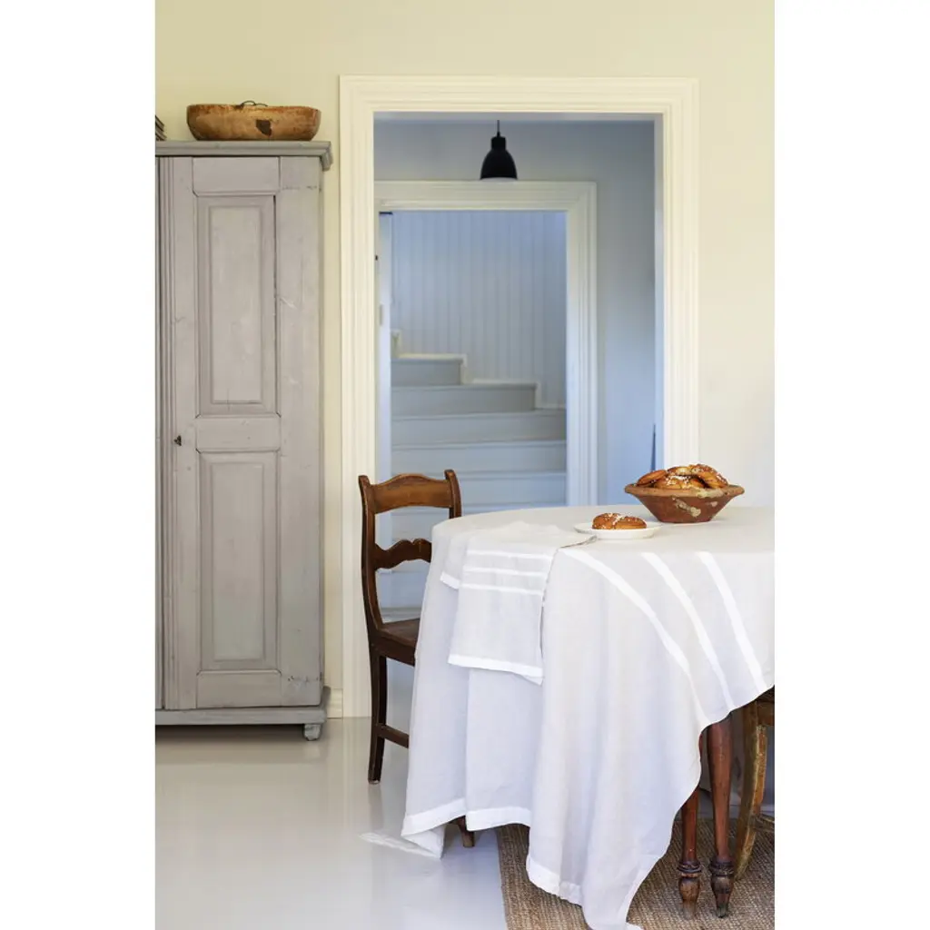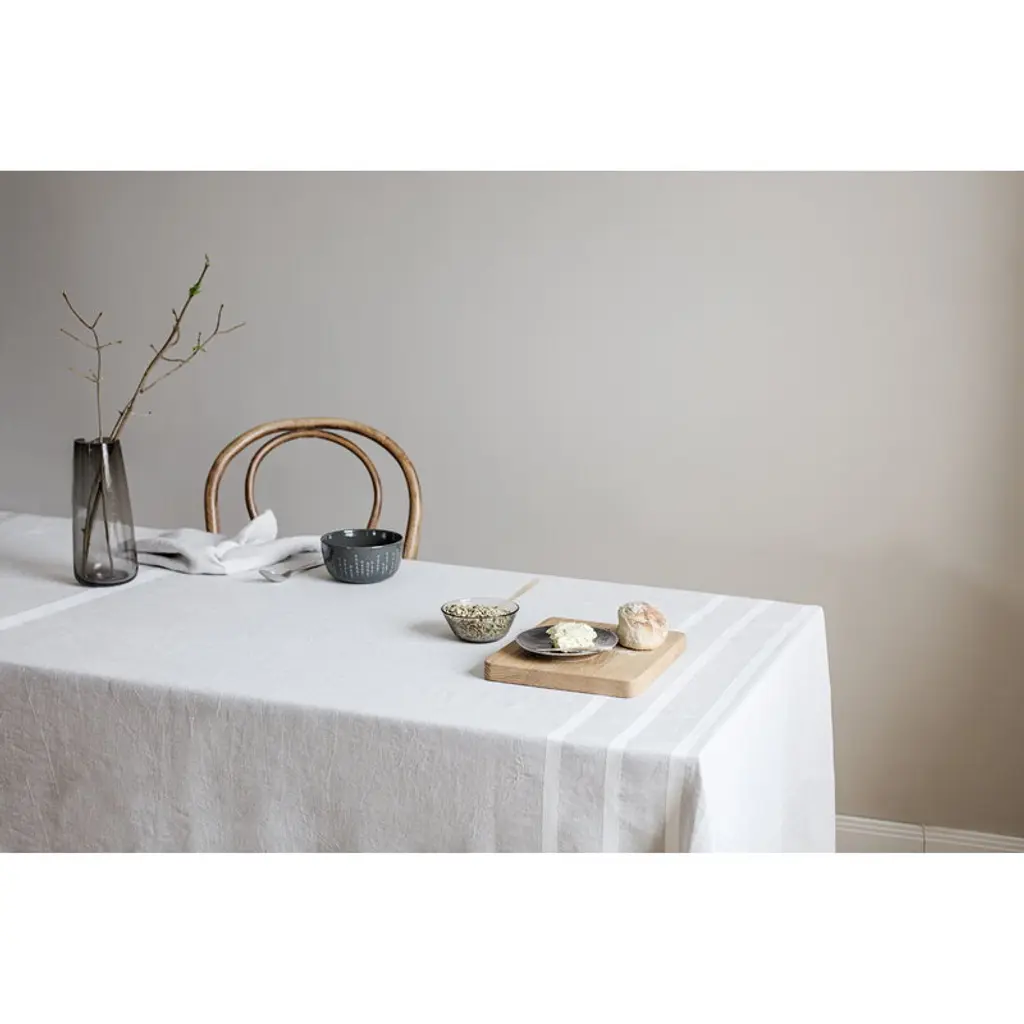 The Usva tablecloth by Lapuan Kankurit is made of washed European linen, a carefree material with a naturally laid-back appearance that is ideal for rustic modern table settings. It is not necessary to iron the tablecloth – small wrinkles and creases give the tablecloth a relaxed, natural look. However, if you prefer a neater style, you can iron the tablecloth with linen adjustments. Characteristic of undyed linen, the tablecloth gets lighter and softer with each wash. The linen cloth is decorated with a classic, minimalist stripe pattern designed by Anu Leinonen. Thanks to its large size, machine-washable material and unassuming pattern, the Usva tablecloth is very versatile: in addition to table settings, it also serves as a light blanket for daytime napping or sitting down on the beach, or even as beautifully neutral linen curtains. The striped linen cloth is woven at the Lapuan Kankurit weaving mill in Finland.