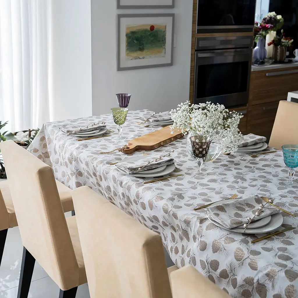 Featuring metallic accents and bronze hues, this tablecloth is ideal for any winter holiday setting. Pair it with your favorite tableware and a few votives to create the perfect ambiance.
