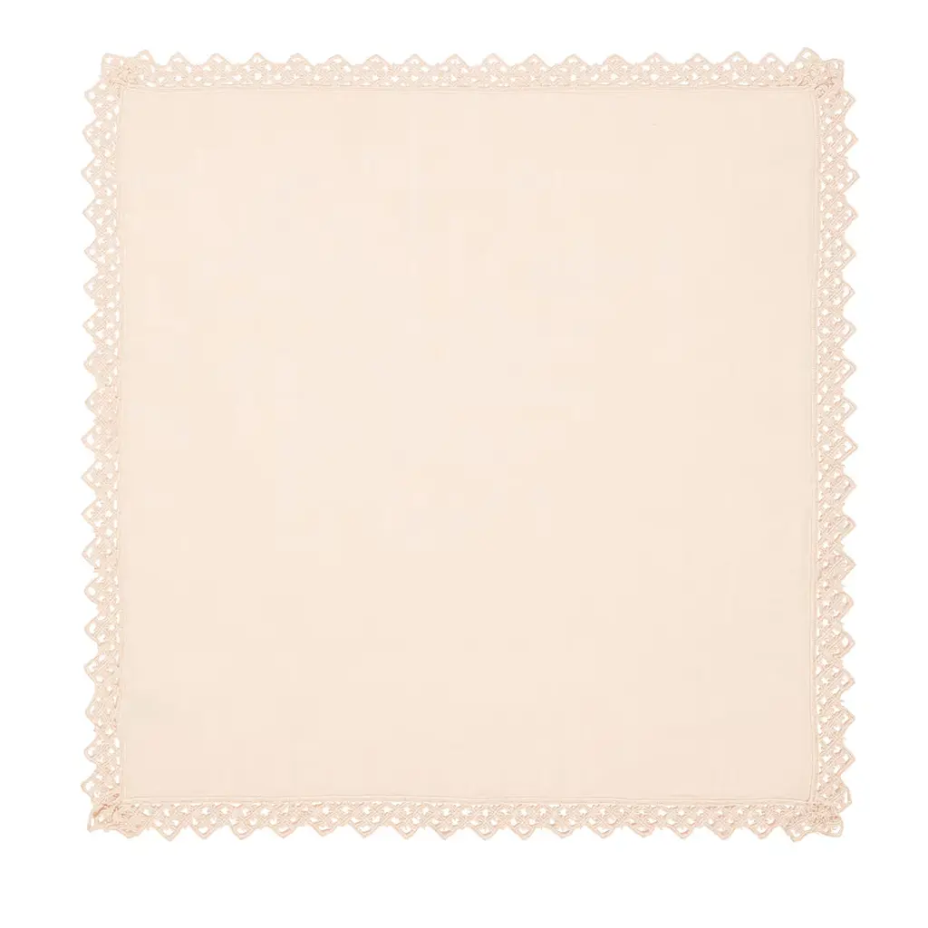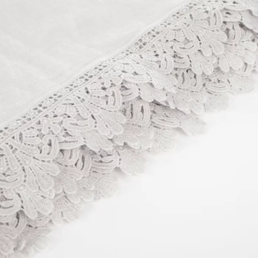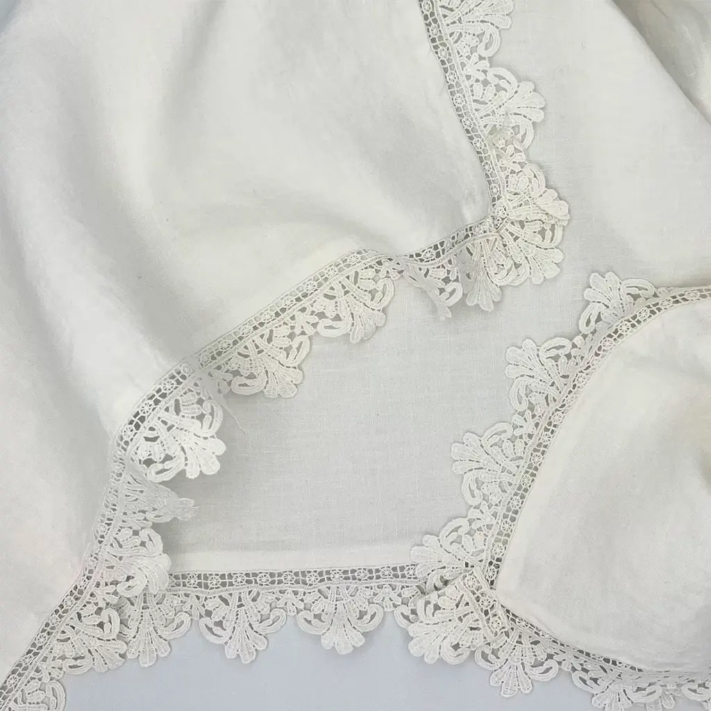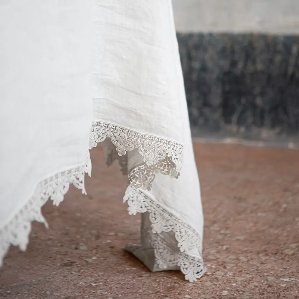 Elevate your dining experience with this white linen tablecloth, featuring sophisticated embroidered edging and romantic Sicilian lace. The artisanal detailing adds a refined touch to any table setting. Perfect for adding a graceful, timeless charm to both everyday and special occasions. Available in various sizes and a wide range of colors, it combines elegance with versatility. For other details, please ask the concierge.