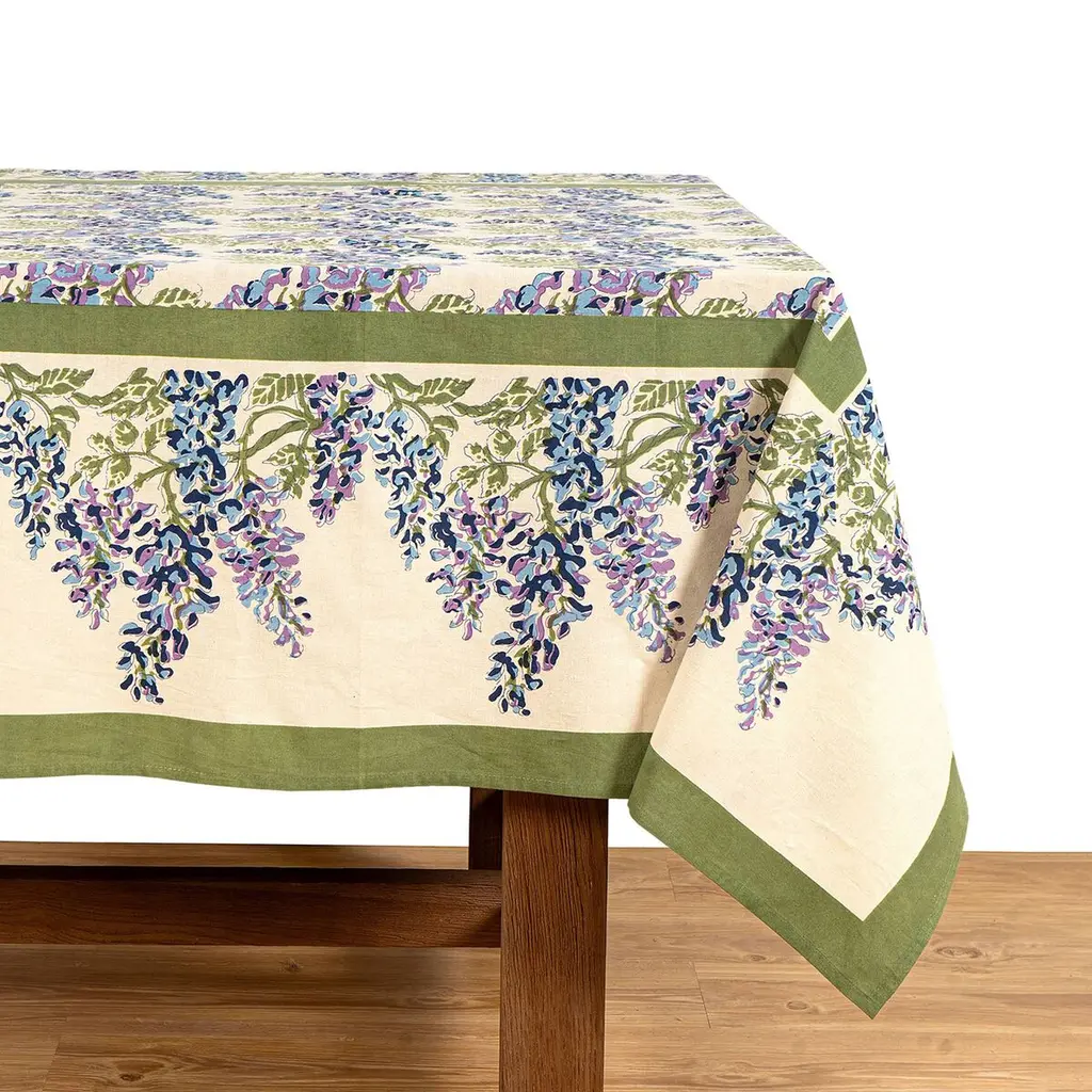 The Wisteria collection features olive green vines with delicate pendant-like blooms. The ivory background with it’s cascading blue and purple-tinged flowers create a beautiful landscape for your delicacies. Dine-in style amidst memories of gorgeously perfumed flower clusters. This elegant piece is a tasteful essential in every linen collection.