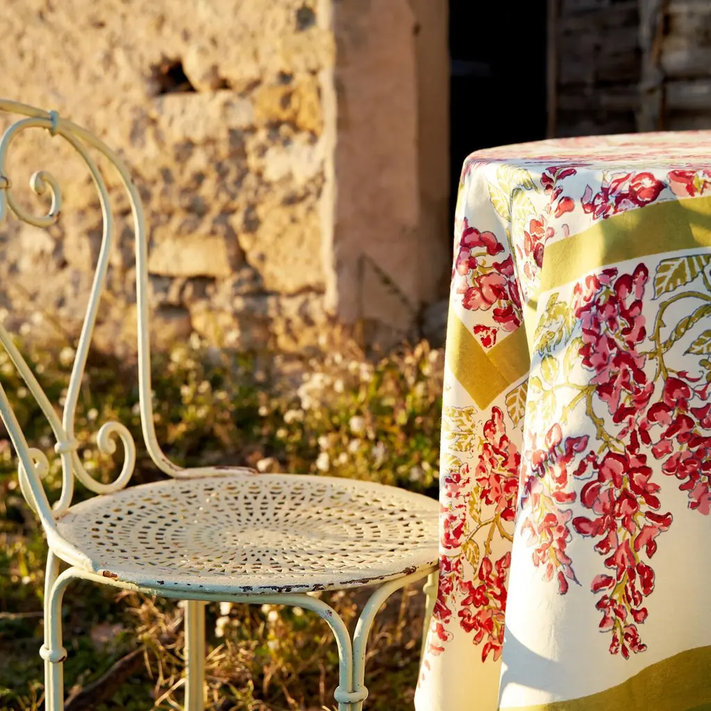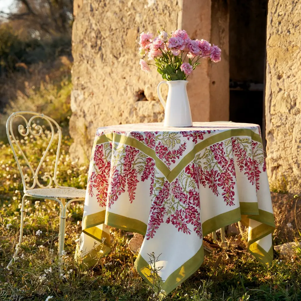 The Wisteria collection features olive green vines with delicate pendant-like blooms. The ivory background with it’s cascading blue and purple-tinged flowers create a beautiful landscape for your delicacies. Dine-in style amidst memories of gorgeously perfumed flower clusters. This elegant piece is a tasteful essential in every linen collection.