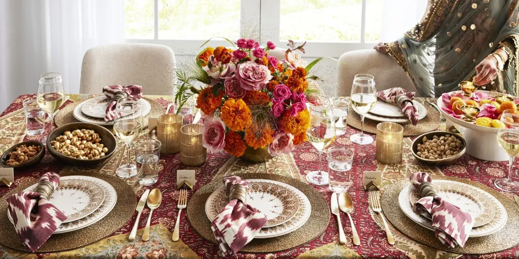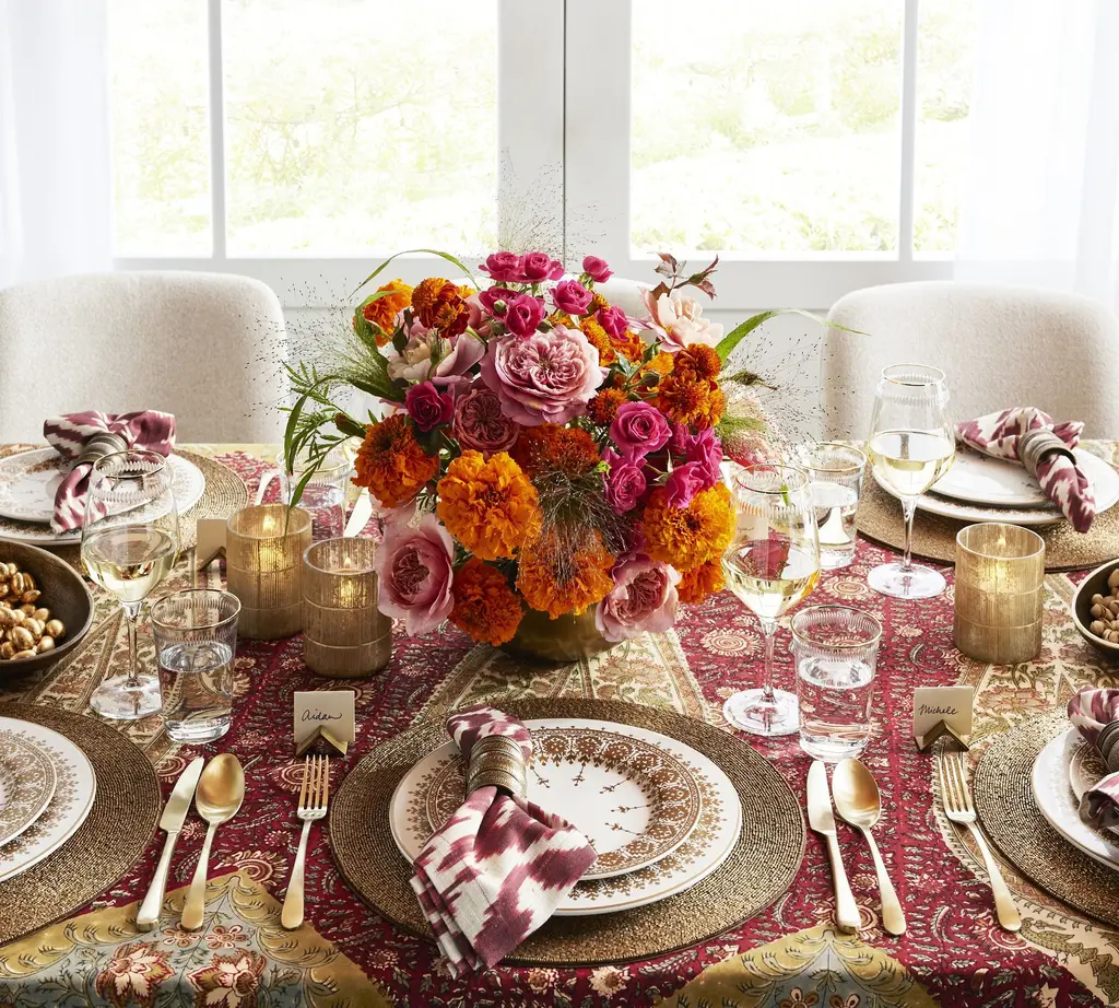 Displaying the rich designs and colorful artwork of traditional Indian hand block printing, this tablecloth features an allover geometric design in rich color scheme. The bold style pairs well with gold flatware and glass candle holders for an inspired table setting.
