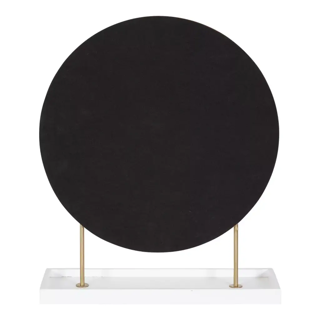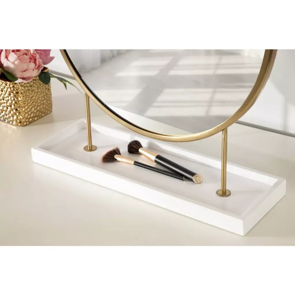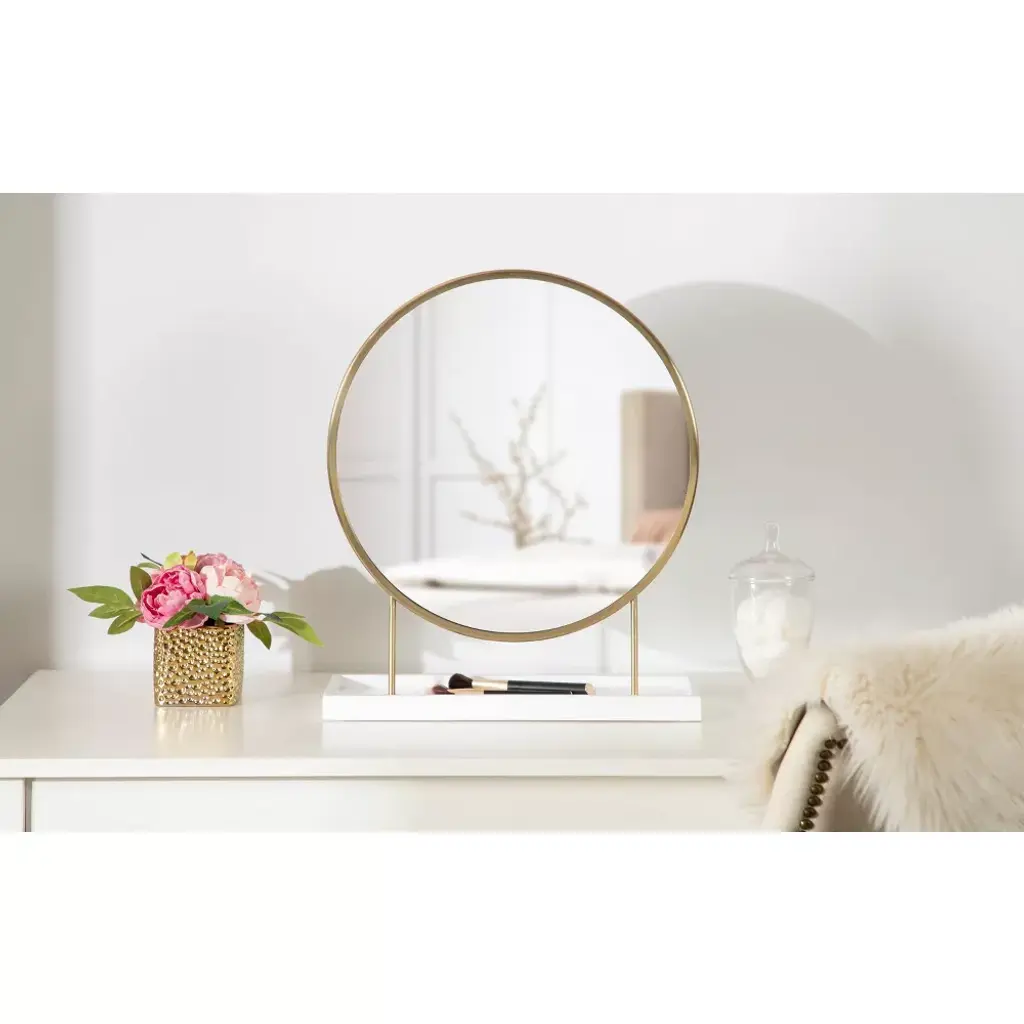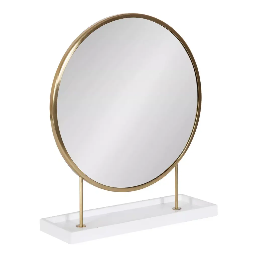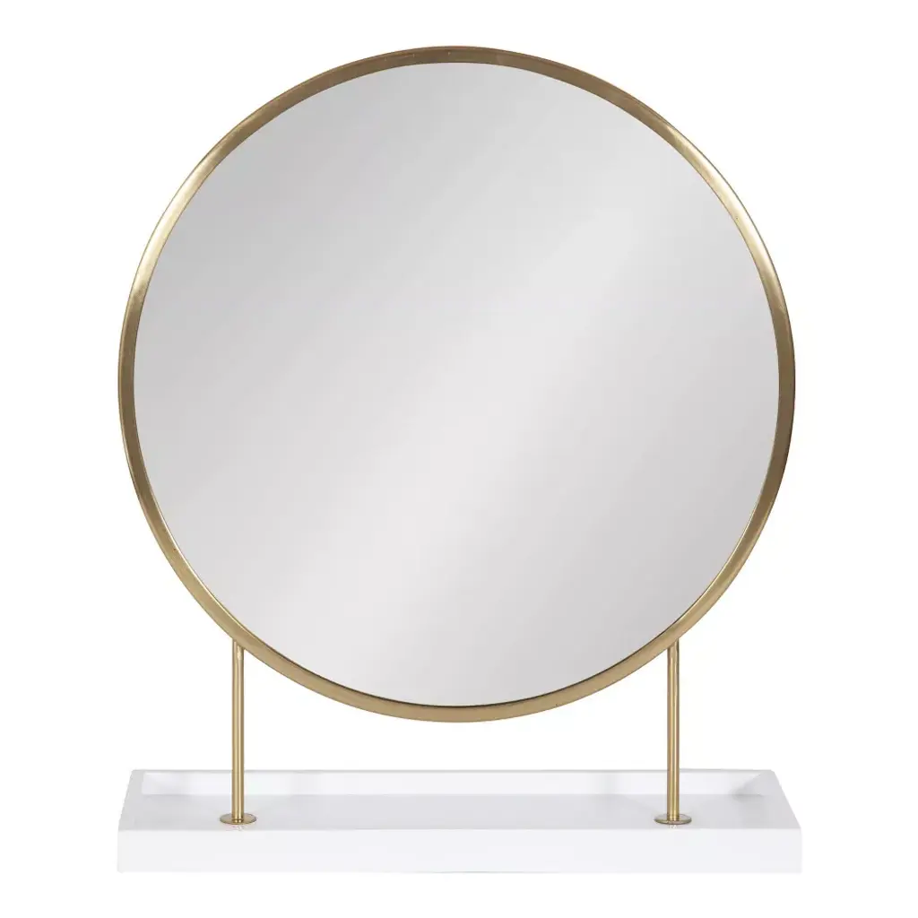 Create a centerpiece that makes a lasting impression with this gorgeous table mirror. The Kate and Laurel Maxfield tabletop mirror take inspiration from glamorous, modern design to create a beautiful accent piece for your home. It features a circular mirror elevated by a metal frame attached to a solid wood base. This mirror was handcrafted in India, making each piece in the collection distinct in woodgrain and finish. The metal frame features a lovely gold finish, while the wood base has a refined white finish. The Maxfield's overall dimensions are 18 inches wide by 6 inches deep by 22 inches tall, making it a staggering accent piece on a vanity, console table, dresser, or dining room table. The wood base attached to the mirror adds an extra dimension of functionality to the mirror, providing a surface to quickly stash jewelry, makeup powder, keys, and more. The Maxfield brings vibrancy and elegance to your home while creating a staggering focal point. This tabletop mirror has an easy assembly process, with only 2 steps separating you from this modern statement piece's full beauty.