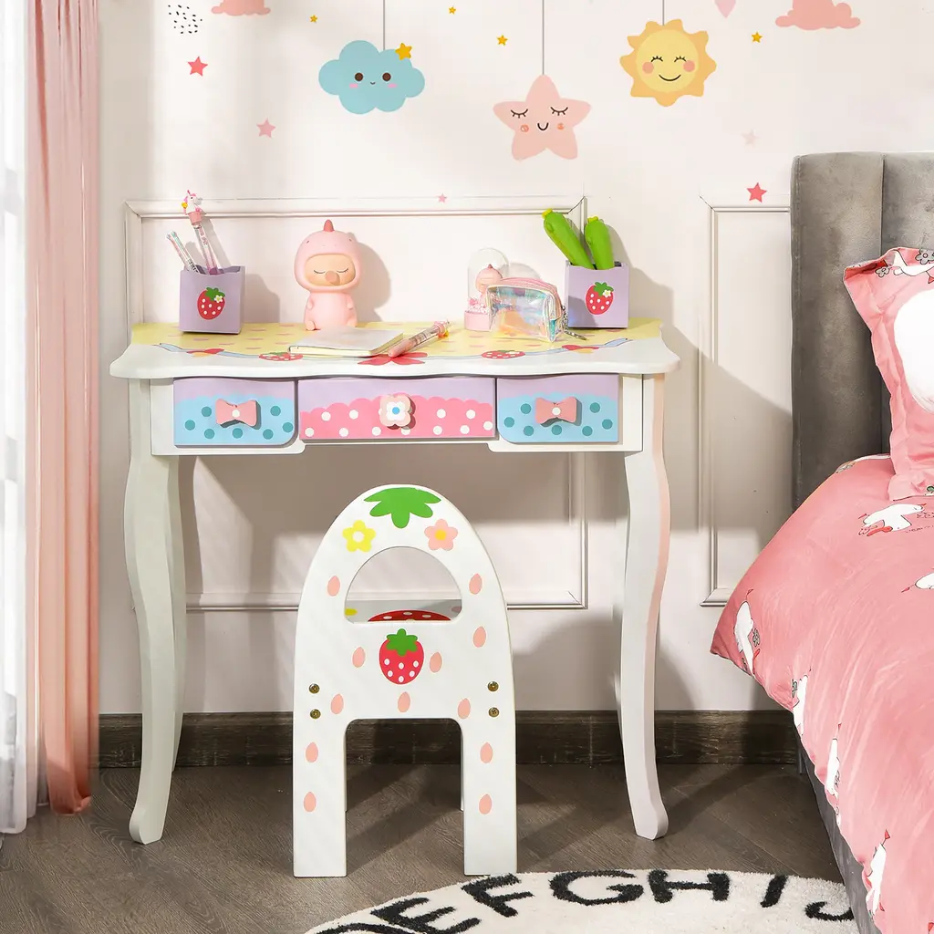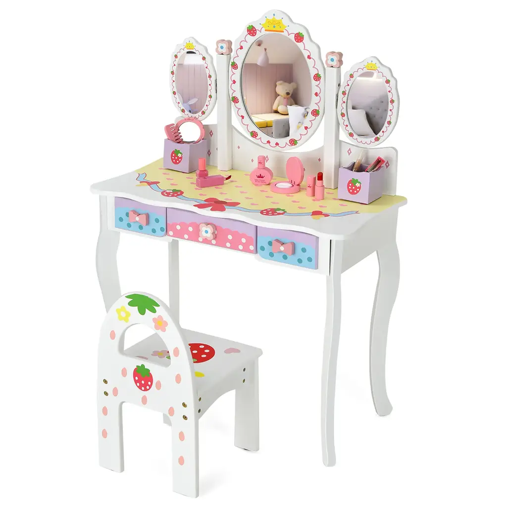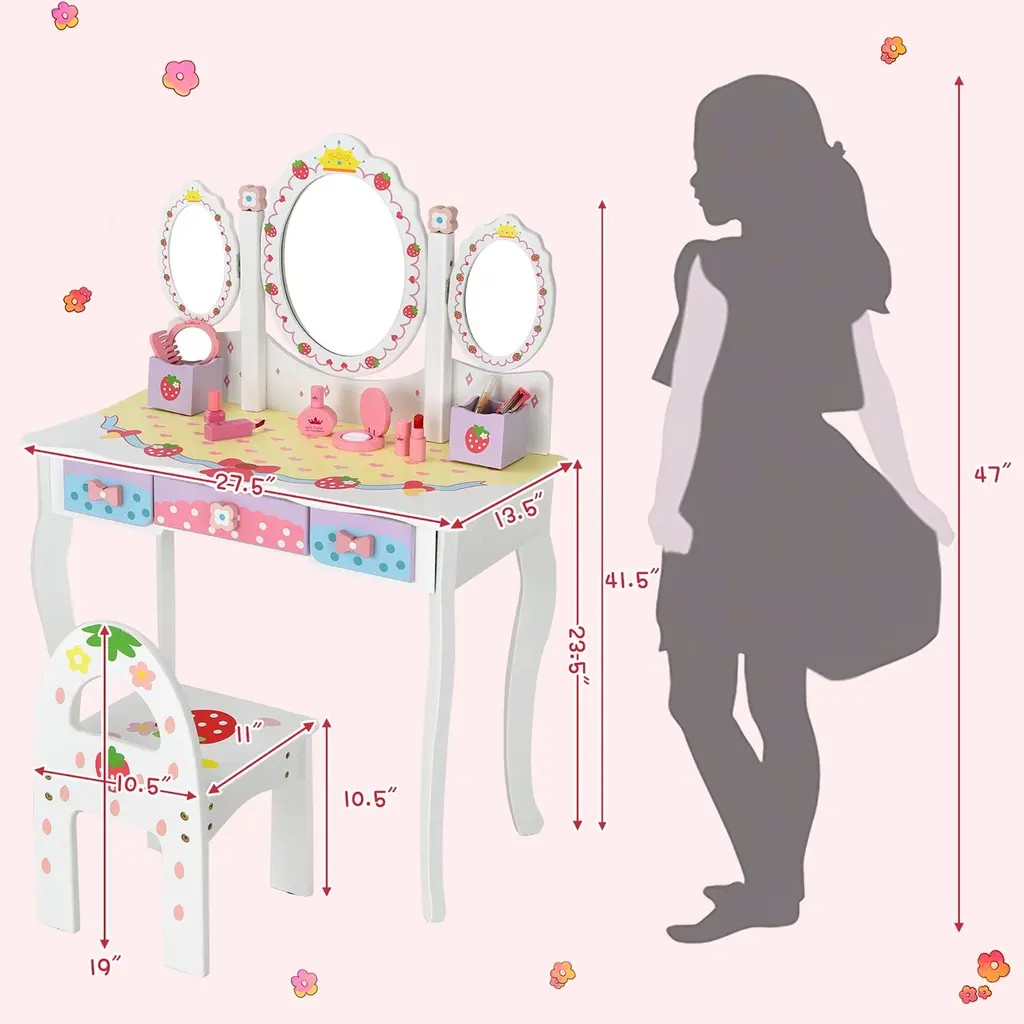 Are you worried about what gifts to give to your children? Our kids makeup table and chair set must be your ideal choice! Crafted from premium MDF with an anti-toppling device at the back, this kids vanity set is pretty stable and sturdy. Our adorable dressing table is equipped with a tri-fold mirror and a chair, allowing kids to sit comfortably when doing their hair or makeup. Meanwhile there are 3 drawers and 2 small girds to store their own jewelry, cosmetics, combs, brushes, etc. Featuring cute patterns on the surface, this pink vanity set will be a perfect gift for your kids. Features:Specification