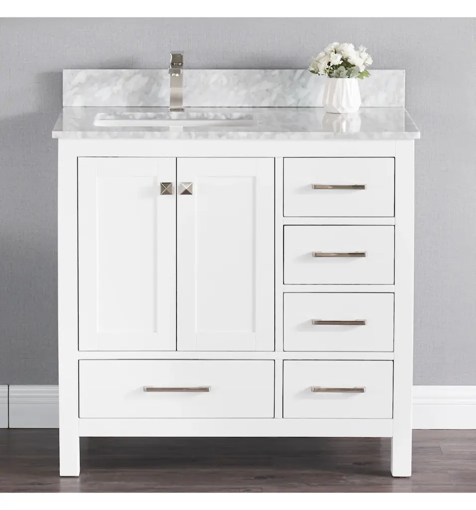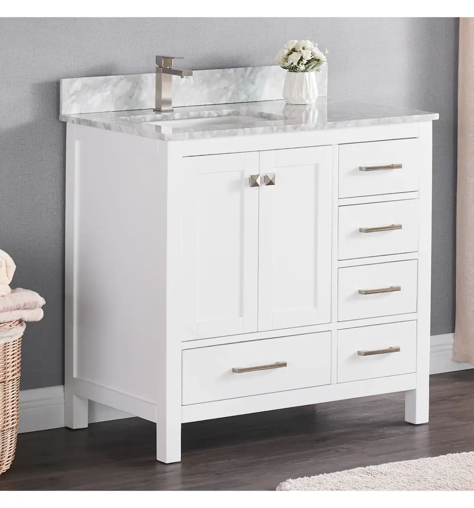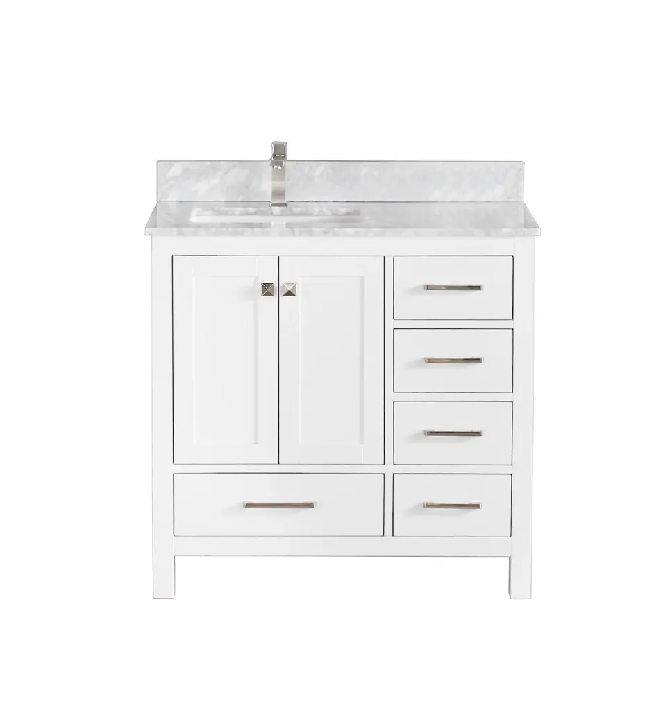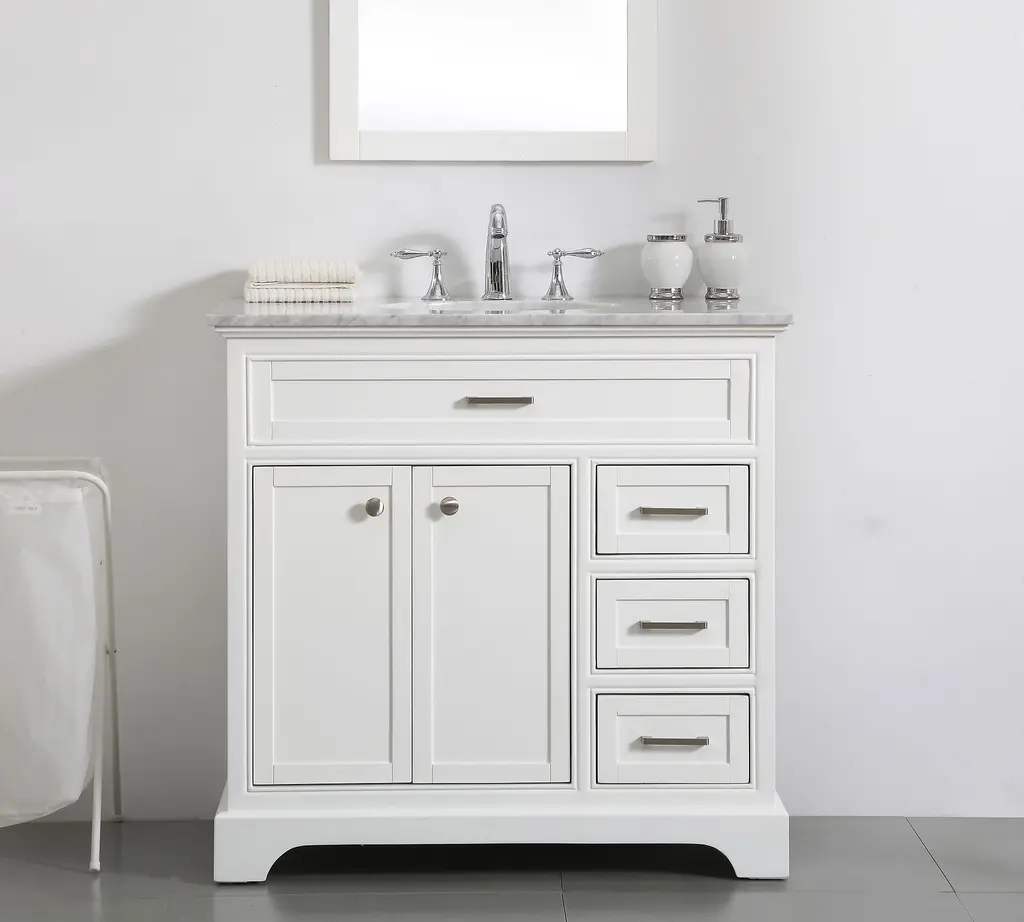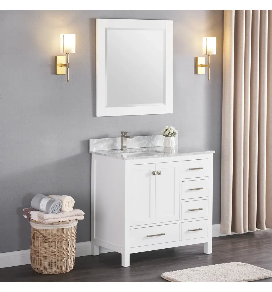 36" Vanity With White Marble Left Side Sink With Mirror, No Backsplash, White