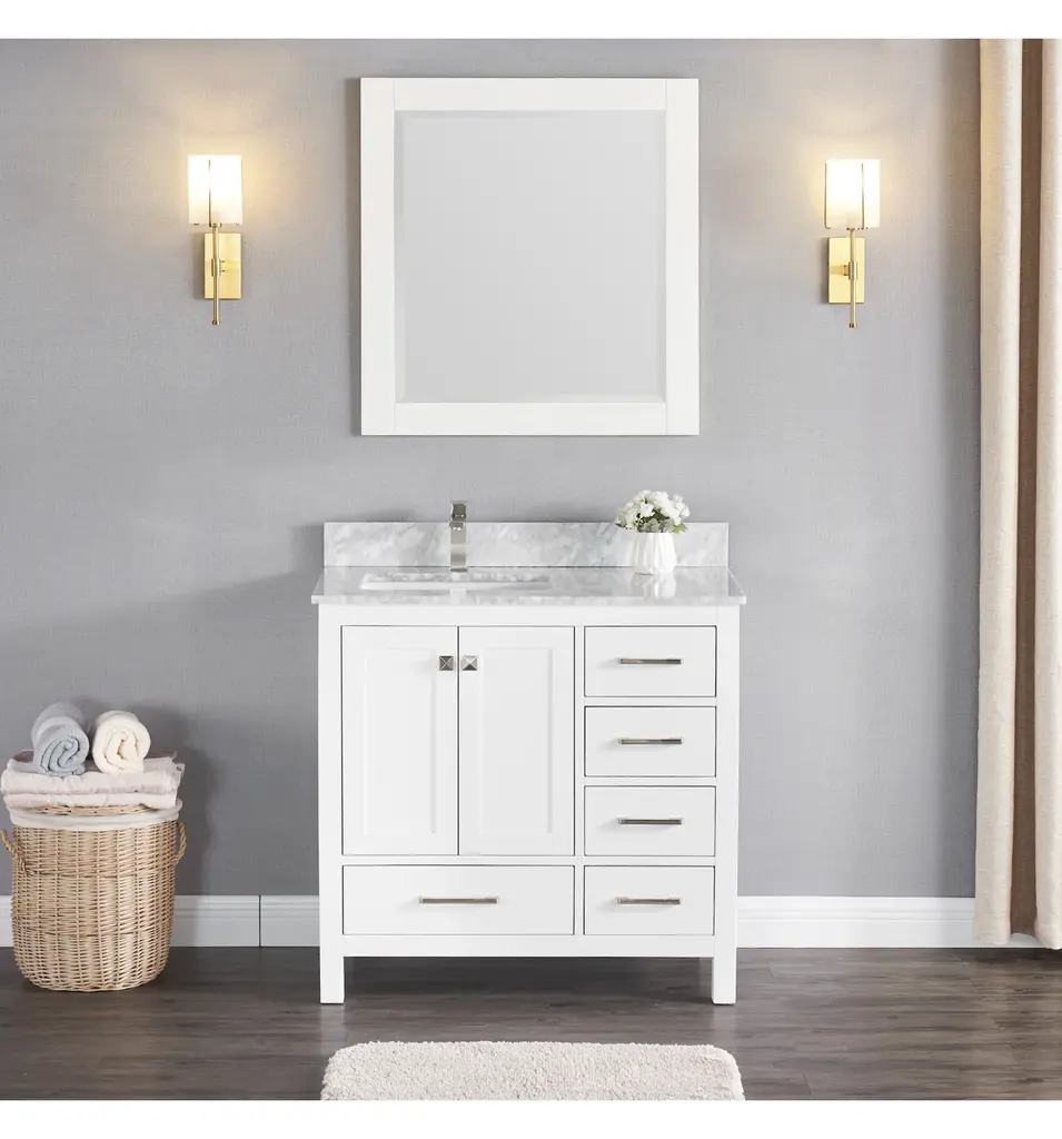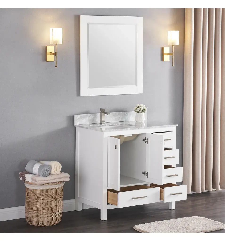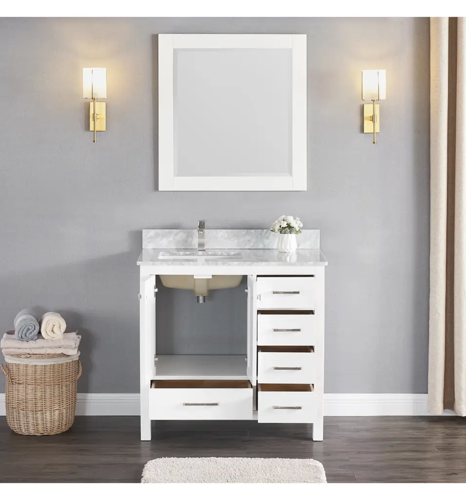 Luxury charm with premium quality vanity set is the best choice. It is crafted with solid wood cabinet and 3/4" thick natural white carrara marble countertop with white ceramic under mount basin.Convenient access for plumbing installation with cut out back panel. Freestanding, no assembly required. The Mirror is optional, please see the other listing