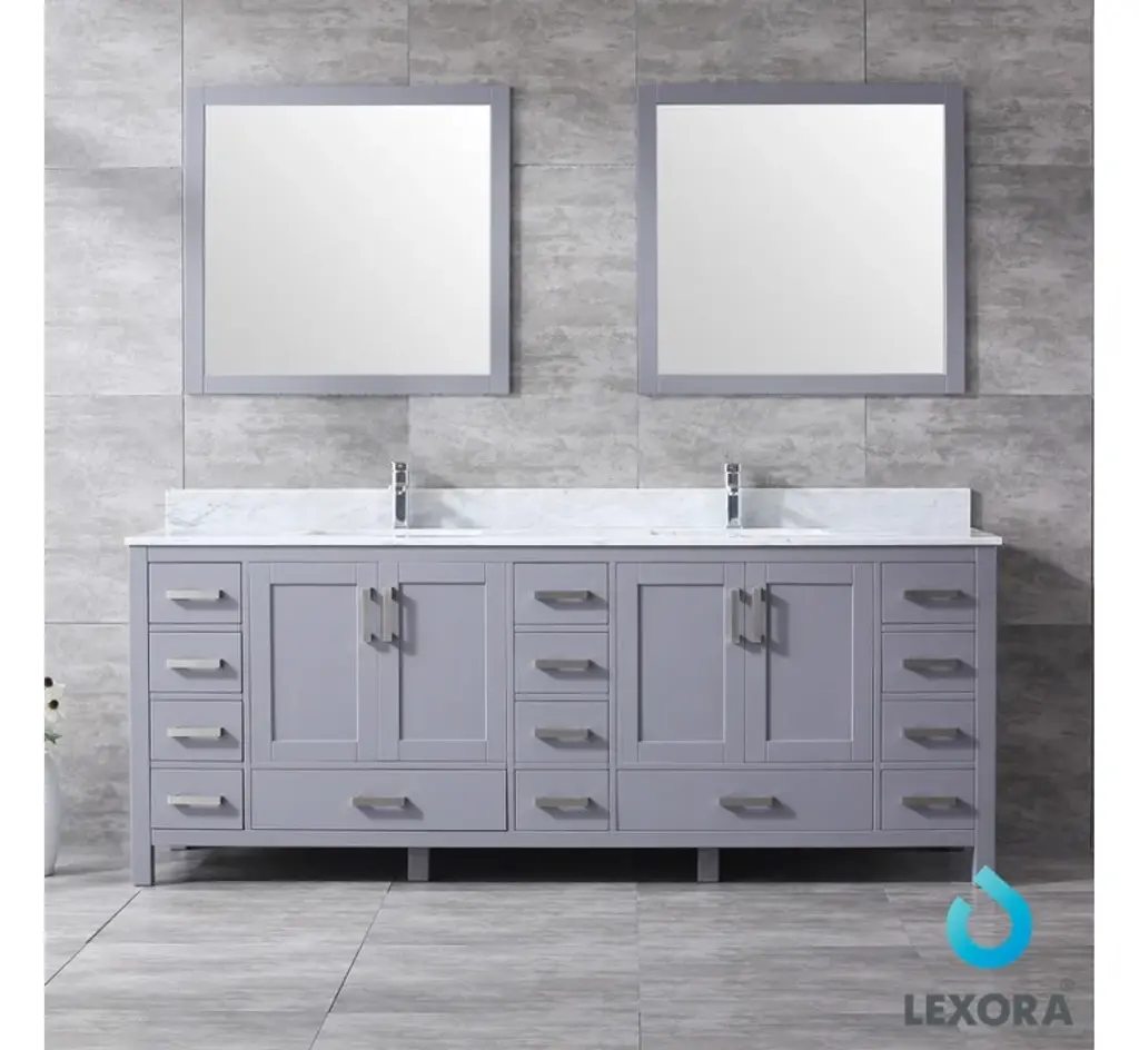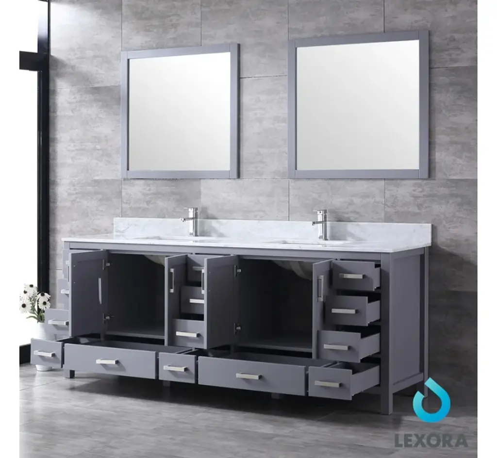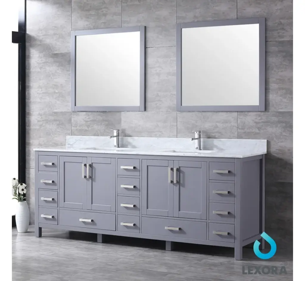 The Jacques vanity in dark grey from Lexora provides a beautiful, contemporary style to any bathroom. With sleek, clean lines and a cool, neutral finish, the beauty is only matched by its seamless functionality. The cabinet doors and drawers feature soft-close hinges and slides to increase safety and ensure you never have to hear a slamming cabinet again. With solid birch and rubber wood construction, this piece is as durable as it is stunning. The Jacques vanity comes in 4 different sizes and 3 finishes to fit into any size bathroom and blends with any style. It includes mirrors with matching wood frame, making it the one package you need to finish off your bathroom upgrade.Included: Base Cabinet, MirrorNot Included: Countertop, Backsplash, FaucetDimensions: 84"W X 22"D X 34"H (Tolerance: +/- 1/2")Style: ModernVanity Type: Base Cabinet Only with MirrorMounting Type: FreestandingCountertop Included: NoTop Material: N/ABacksplash Included: NoSink(s) Included: NoNumber of Sinks: Two SinksSink Type: N/ASink Material: N/ASink Dimensions: N/AFaucet Included: NoFaucet Type: N/AFaucet Holes Per Sink: N/AOverflow Drain Included: NoBase Material: Solid Rubber and Birch Wood Frame w/ E0 Grade Plywood PanelsFinish: Dark GrayWood Tone: Medium WoodNumber of Drawers: 14Soft Close Drawers: YesNumber of Doors: 4Soft Close Doors: YesNumber of Shelves: 0Shelves Adjustable: N/AShelves Removable: N/AHardware Finish: ChromeMirror Included: YesAdditional Details:Open back fits all plumbing typesHandles and pulls may be shipped screwed to the inside of each door or drawer; simply unscrew and attach them to the outsideDo not use harsh cleaning productsDo not use products that contain lemon, vinegar or other acidsProlonged exposure to sunlight may cause discolorationPeriodic resealing is recommended for marble topsAccommodates a standard size drain and p-trap (sold separately)