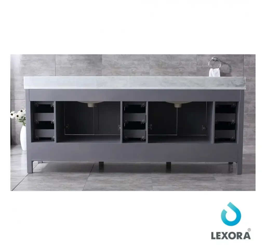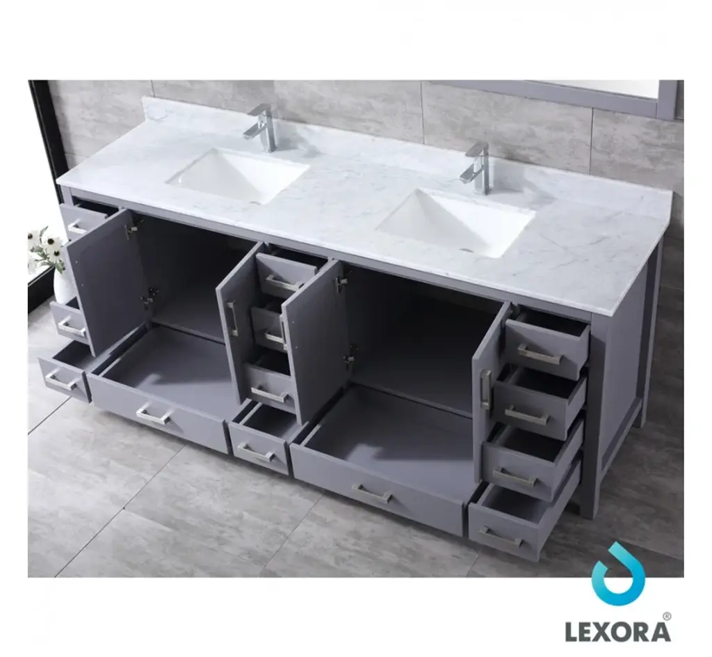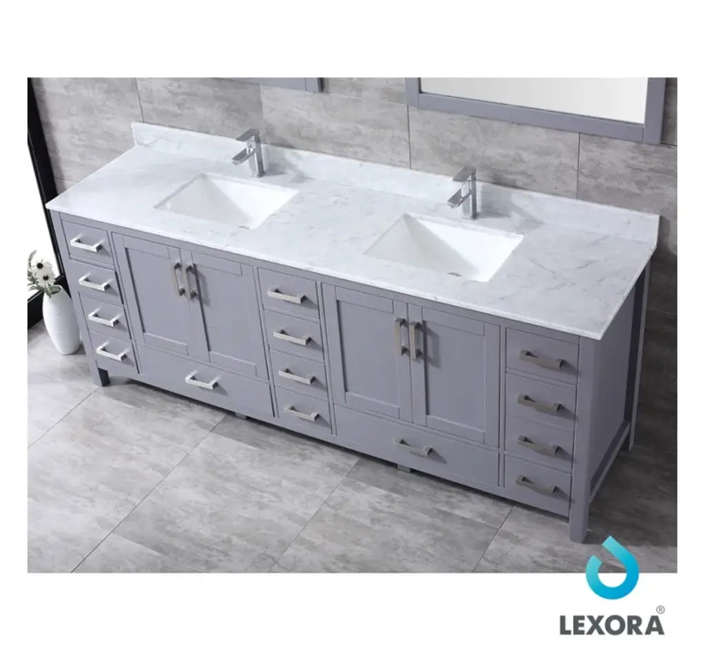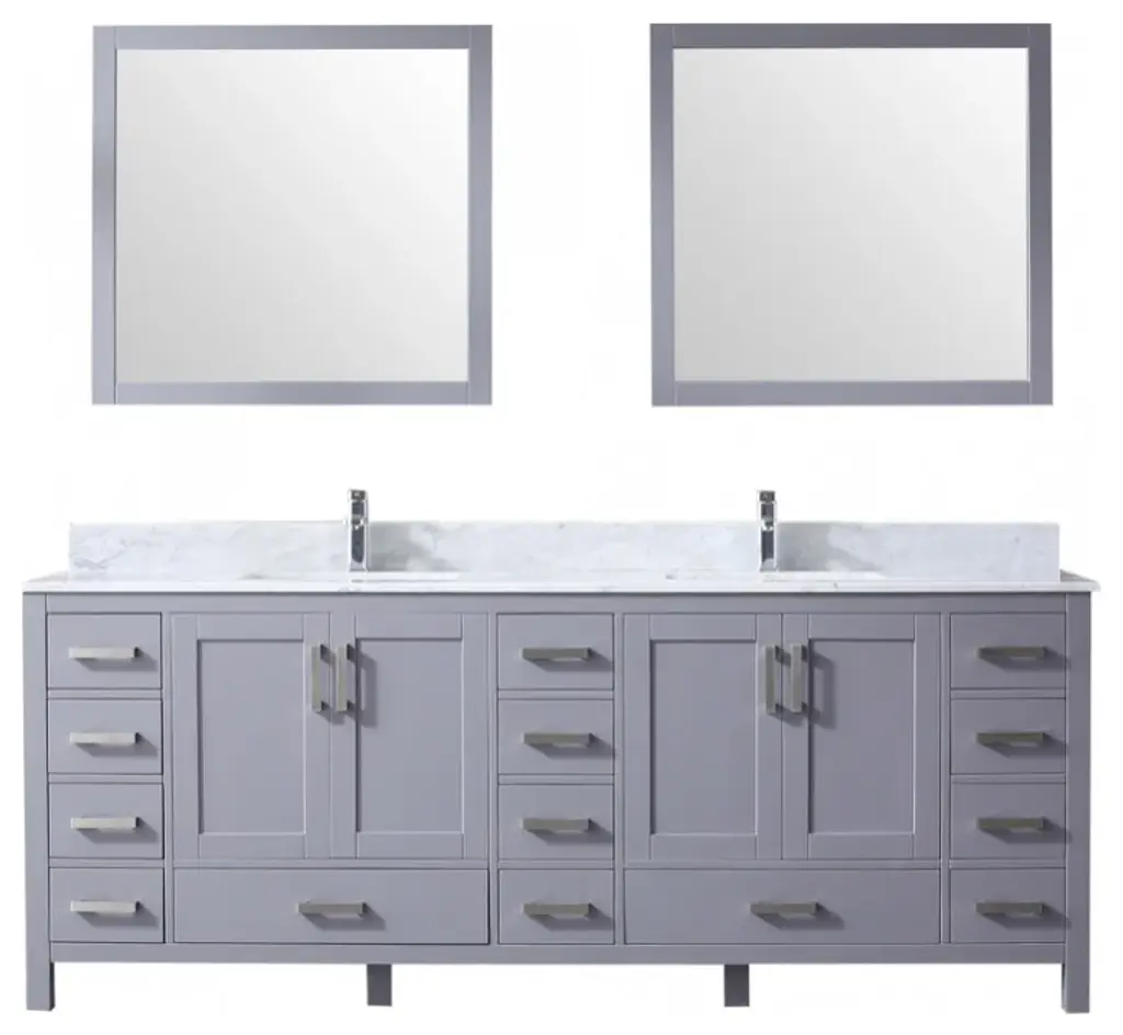 The Jacques vanity in dark grey from Lexora provides a beautiful, contemporary style to any bathroom. With sleek, clean lines and a cool, neutral finish, the beauty is only matched by its seamless functionality. The cabinet doors and drawers feature soft-close hinges and slides to increase safety and ensure you never have to hear a slamming cabinet again. With solid birch and rubber wood construction, this piece is as durable as it is stunning. The Jacques vanity comes in 4 different sizes and 3 finishes to fit into any size bathroom and blends with any style. It includes mirrors with matching wood frame, making it the one package you need to finish off your bathroom upgrade.Included: Base Cabinet, MirrorNot Included: Countertop, Backsplash, FaucetDimensions: 84"W X 22"D X 34"H (Tolerance: +/- 1/2")Style: ModernVanity Type: Base Cabinet Only with MirrorMounting Type: FreestandingCountertop Included: NoTop Material: N/ABacksplash Included: NoSink(s) Included: NoNumber of Sinks: Two SinksSink Type: N/ASink Material: N/ASink Dimensions: N/AFaucet Included: NoFaucet Type: N/AFaucet Holes Per Sink: N/AOverflow Drain Included: NoBase Material: Solid Rubber and Birch Wood Frame w/ E0 Grade Plywood PanelsFinish: Dark GrayWood Tone: Medium WoodNumber of Drawers: 14Soft Close Drawers: YesNumber of Doors: 4Soft Close Doors: YesNumber of Shelves: 0Shelves Adjustable: N/AShelves Removable: N/AHardware Finish: ChromeMirror Included: YesAdditional Details:Open back fits all plumbing typesHandles and pulls may be shipped screwed to the inside of each door or drawer; simply unscrew and attach them to the outsideDo not use harsh cleaning productsDo not use products that contain lemon, vinegar or other acidsProlonged exposure to sunlight may cause discolorationPeriodic resealing is recommended for marble topsAccommodates a standard size drain and p-trap (sold separately)