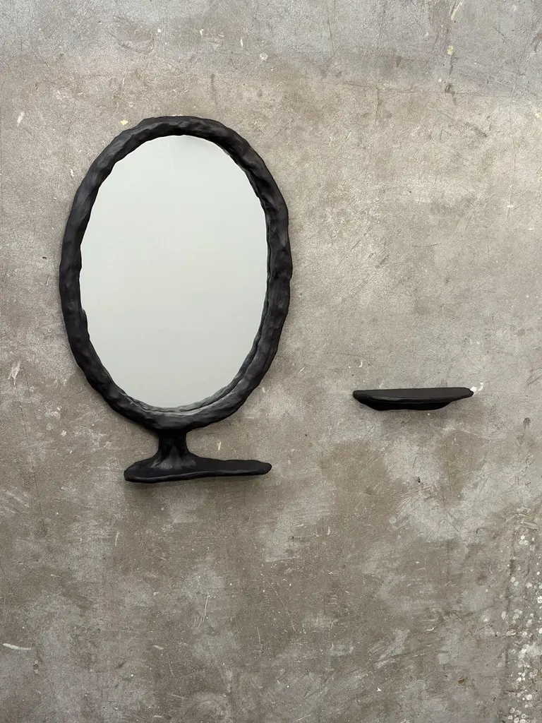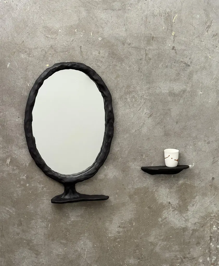 Abstract Wood Mirror by Atelier MonochromeOne of a kind.Materials: Ceramic / Porcelain.Dimensions: Ø 30 x H 45.Atelier Monochrome is a space dedicated to the artisanal creation of unique porcelain pieces. The designer Myrtille Ronteix creates both custom-made pieces and collections. Among its buyers are architects, designers, boutiques and individuals. The workshop is also a meeting place, where Myrtille collaborates with ceramists, cabinetmakers, weavers, and all sorts of other artists and artisans. The designer designs collections of flowers and jewelry, wall installations and various accessories for tableware, produced in limited series according to her inspiration. Between strength and subtlety, minimalism and refinement, his creations have a refined aesthetic, a signature recognizable at first glance. Inspiration If nature is at the heart of her work, she is also greatly inspired by Scandinavian design, Japanese purity, as well as the refinement and poetry of the Italian Renaissance. During her stay in the United Arab Emirates, she discovers the heritage of the land, the fauna, the deserts and the mountains. There she meets Bedouins and learns from these women who perpetuate traditions while striving to preserve their knowledge.The technique Porcelain is a clay rich in kaolin whose whiteness and translucency give it a most contemporary charm. Mineral and sensual material, it is an inexhaustible source of inspiration for this artist.Myrtille works the land like a graphic designer works on a blank page; folds, cuts, embosses, applies patterns and adds natural materials such as wood or more sophisticated materials such as gold and precious stones. She likes to combine ancestral craftsmanship with current techniques such as laser cutting or 3D printing.Each piece is made by hand in the pure tradition of luxury craftsmanship.
