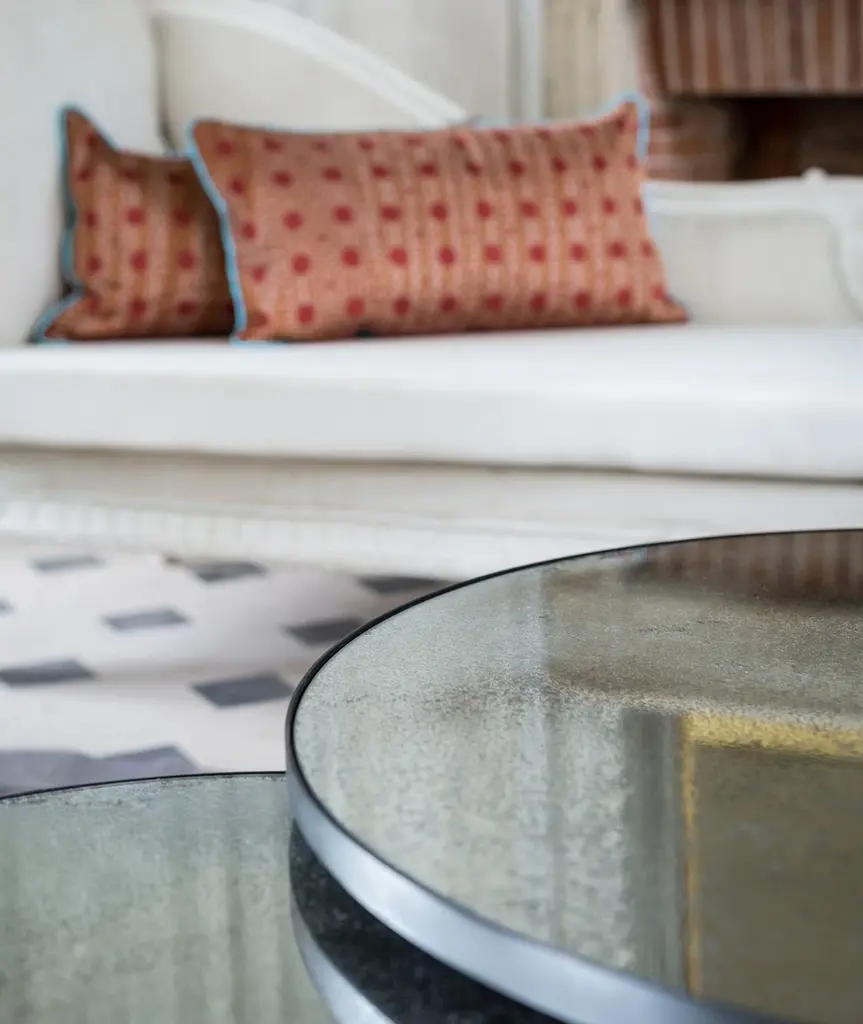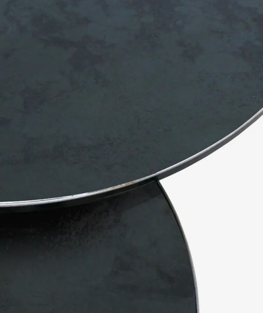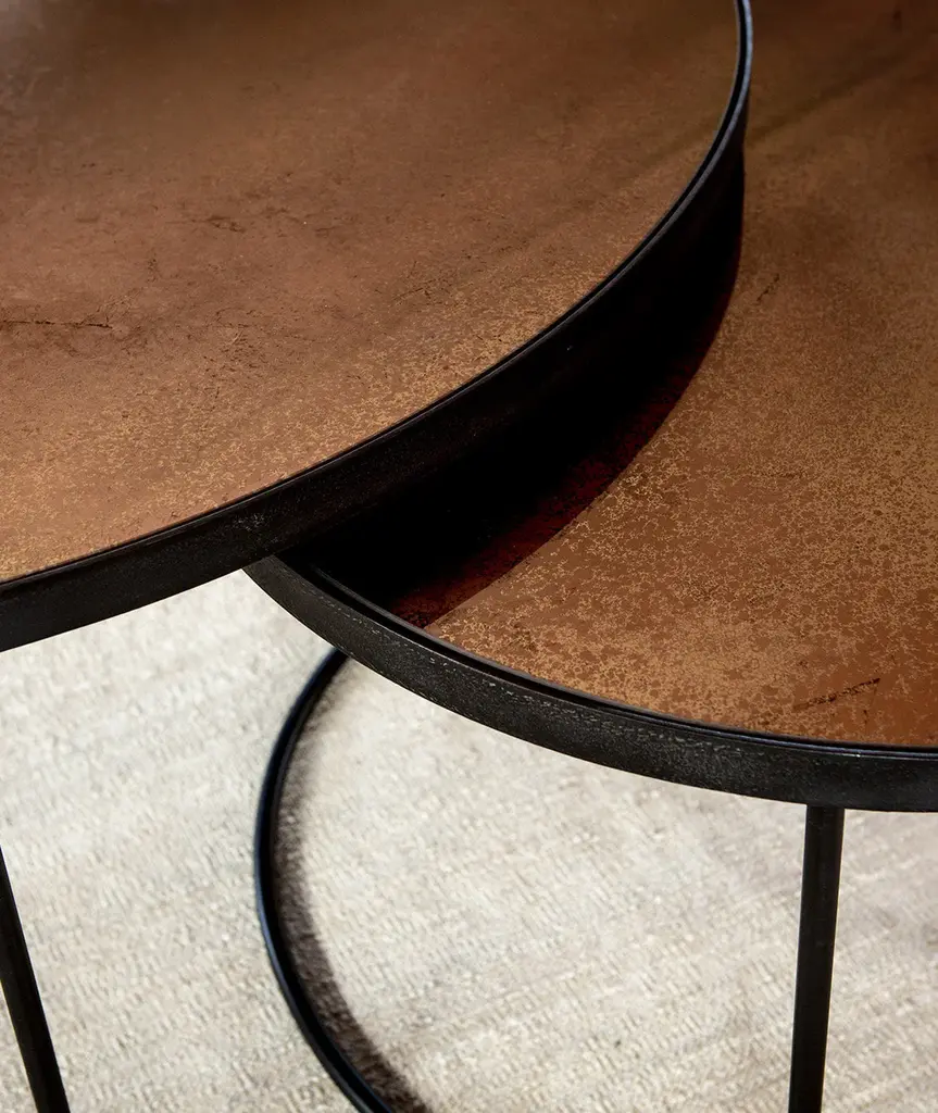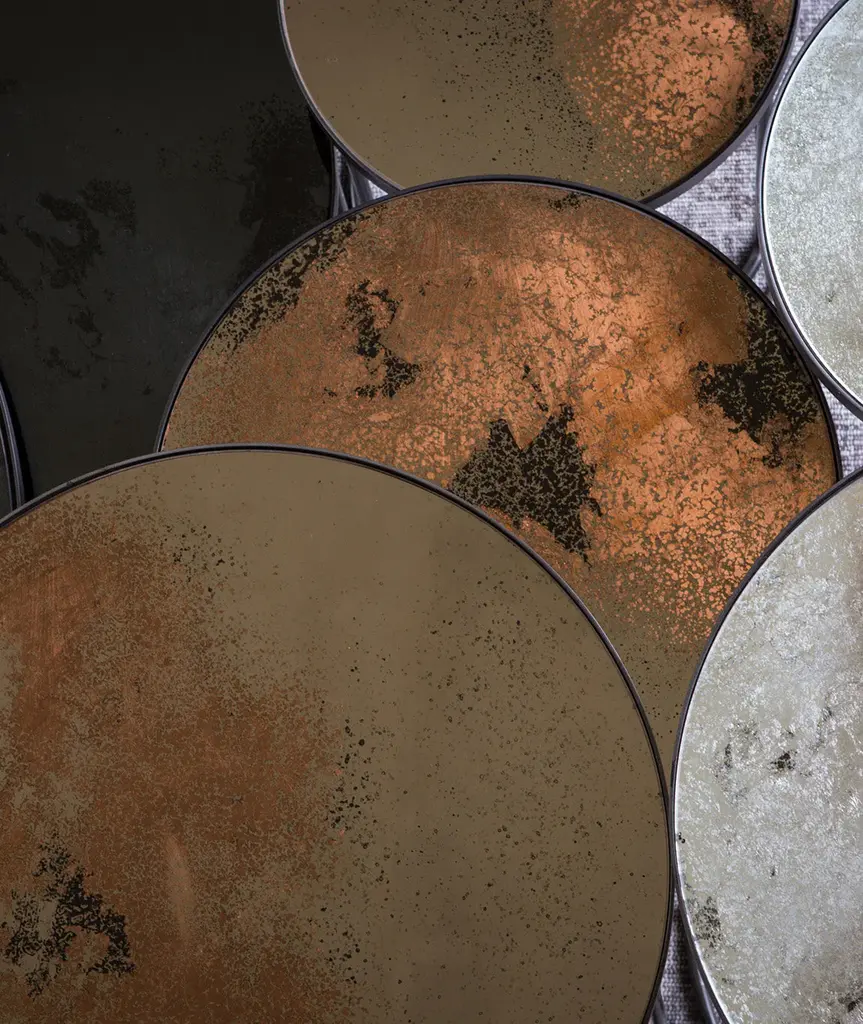 This nesting coffee table set captures the beauty of your environment on its reflective surface. The heavy aged mirrors ooze vintage vibes, while its metal frame brings you right back to modern times.