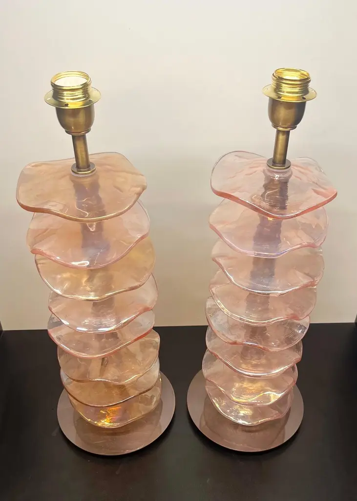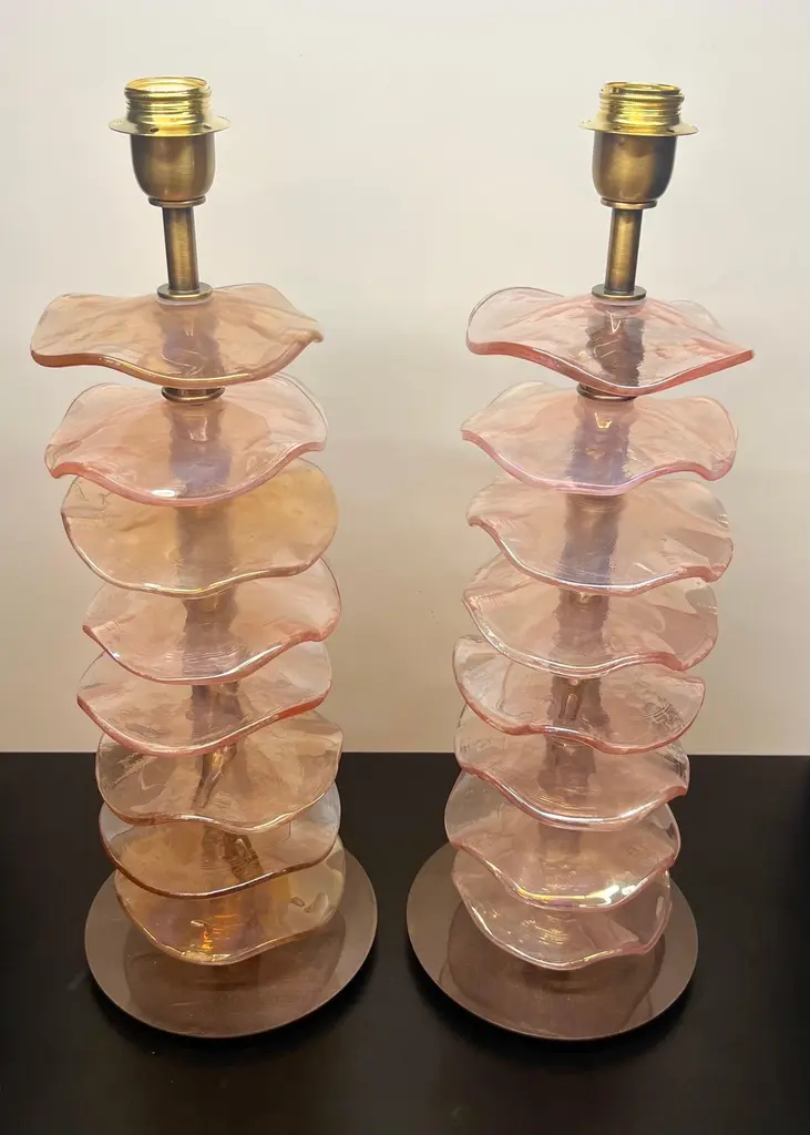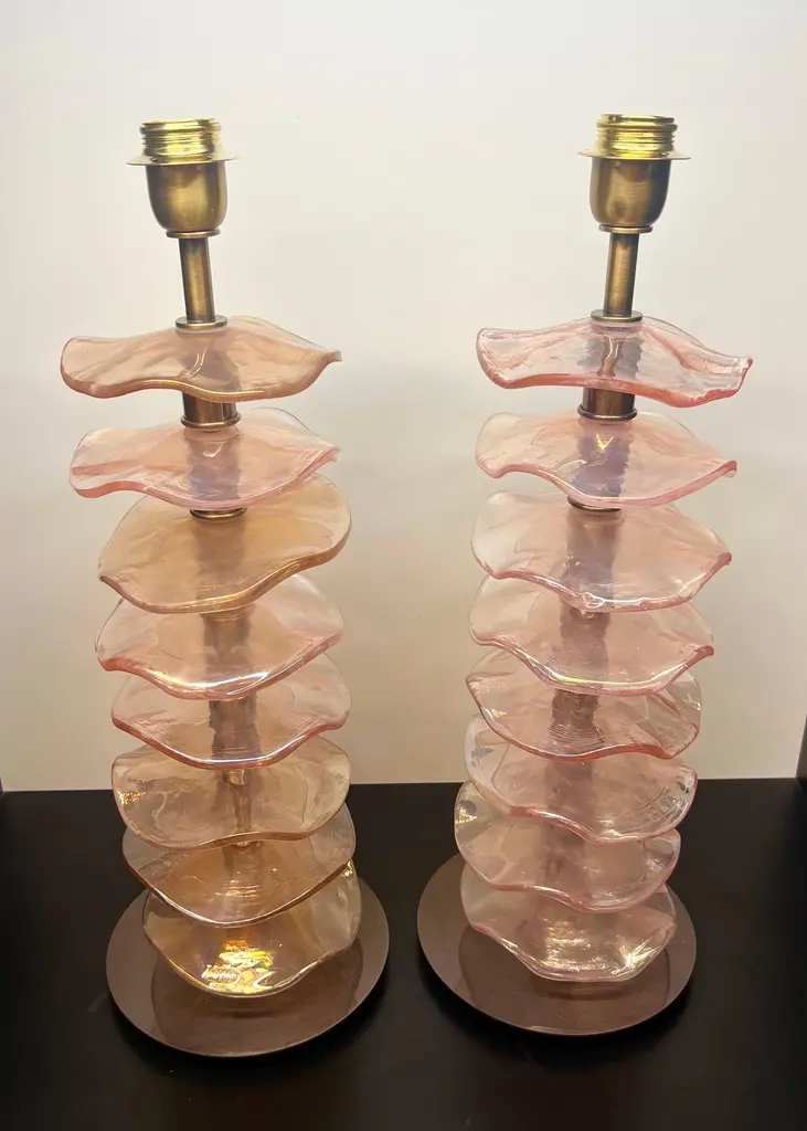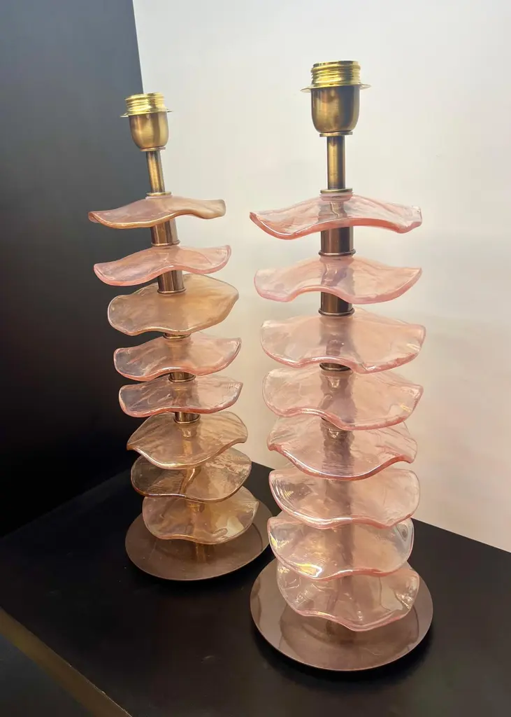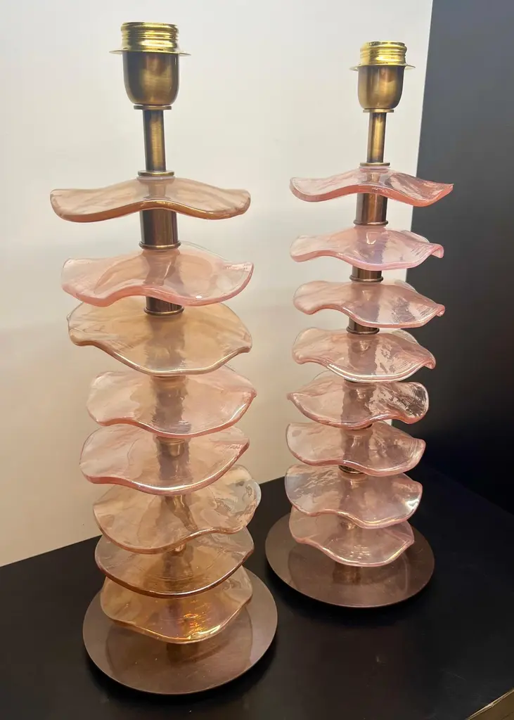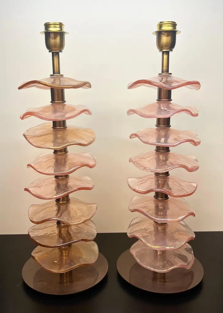 Exclusive pair of Rubin Murano Glass table lamps with satin bronze frame.The lamp has 8 elements of a wavy circular shape in a mirrored ruby colour.Lamp made with great care and precision by our master glassmaker Alberto Donà of Murano.The products are entirely handmade in the Mid-Century Modern style.Project by the master glassmaker of Murano Alberto Donà in 2024.The size of the glass alone is 45cm (17.71 inches).The whole size of the lamp is 56cm (22.04 inches).E26/E27 bulb connection.Complexity is the hallmark of Murano glass lamps. The sheer beauty that radiates into any room is wonderful.The price of the item includes professional and tailor-made packaging.The lamps can be rewired for your country code.