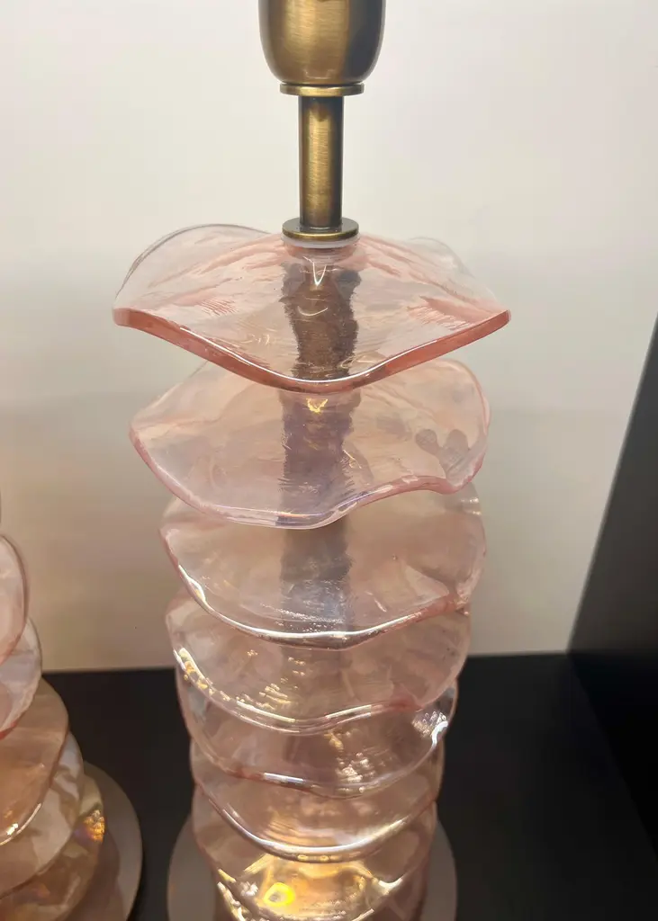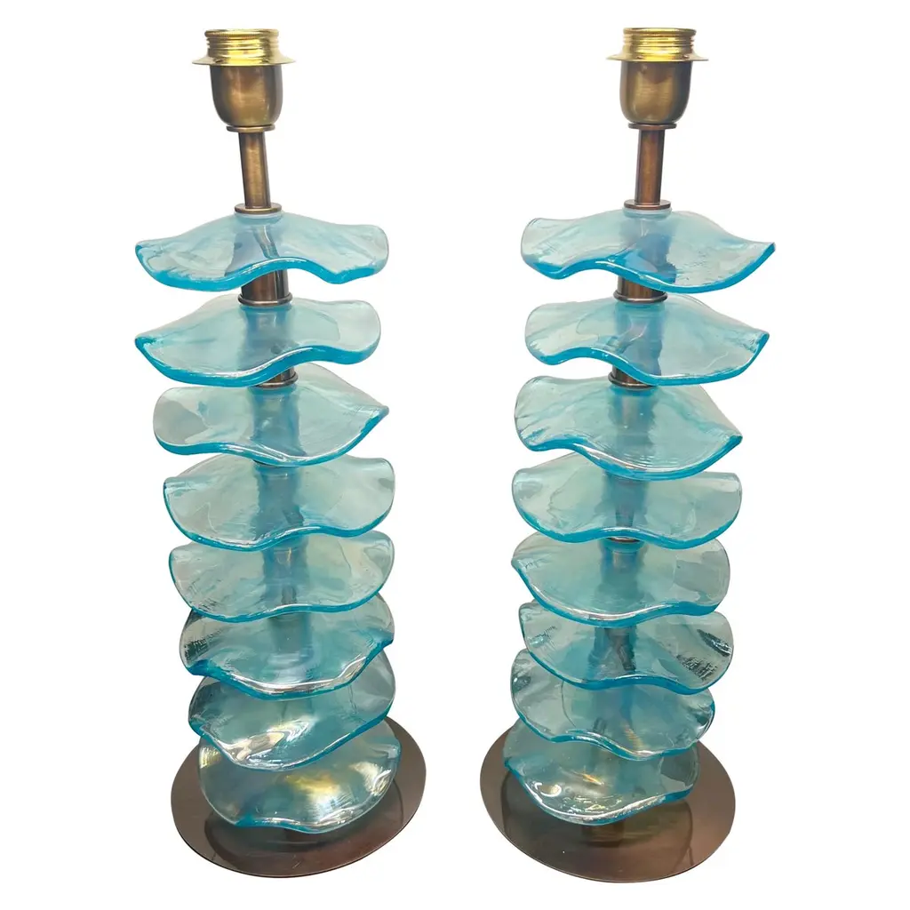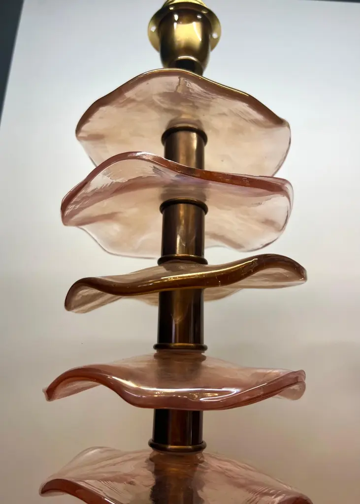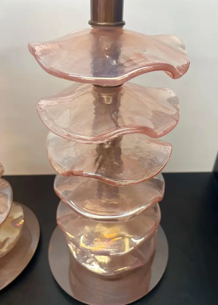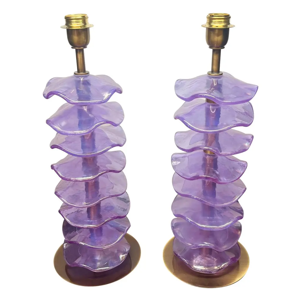 Exclusive pair of Rubin Murano Glass table lamps with satin bronze frame.The lamp has 8 elements of a wavy circular shape in a mirrored ruby colour.Lamp made with great care and precision by our master glassmaker Alberto Donà of Murano.The products are entirely handmade in the Mid-Century Modern style.Project by the master glassmaker of Murano Alberto Donà in 2024.The size of the glass alone is 45cm (17.71 inches).The whole size of the lamp is 56cm (22.04 inches).E26/E27 bulb connection.Complexity is the hallmark of Murano glass lamps. The sheer beauty that radiates into any room is wonderful.The price of the item includes professional and tailor-made packaging.The lamps can be rewired for your country code.