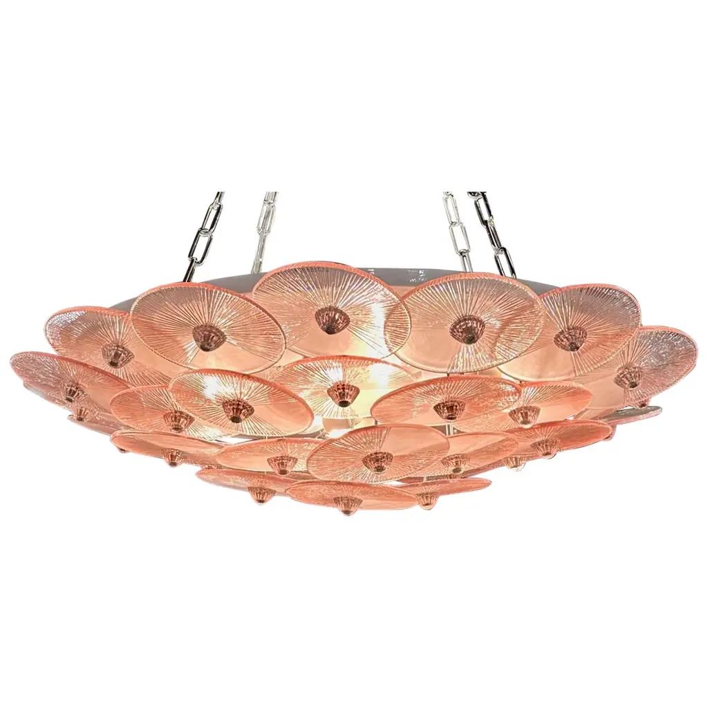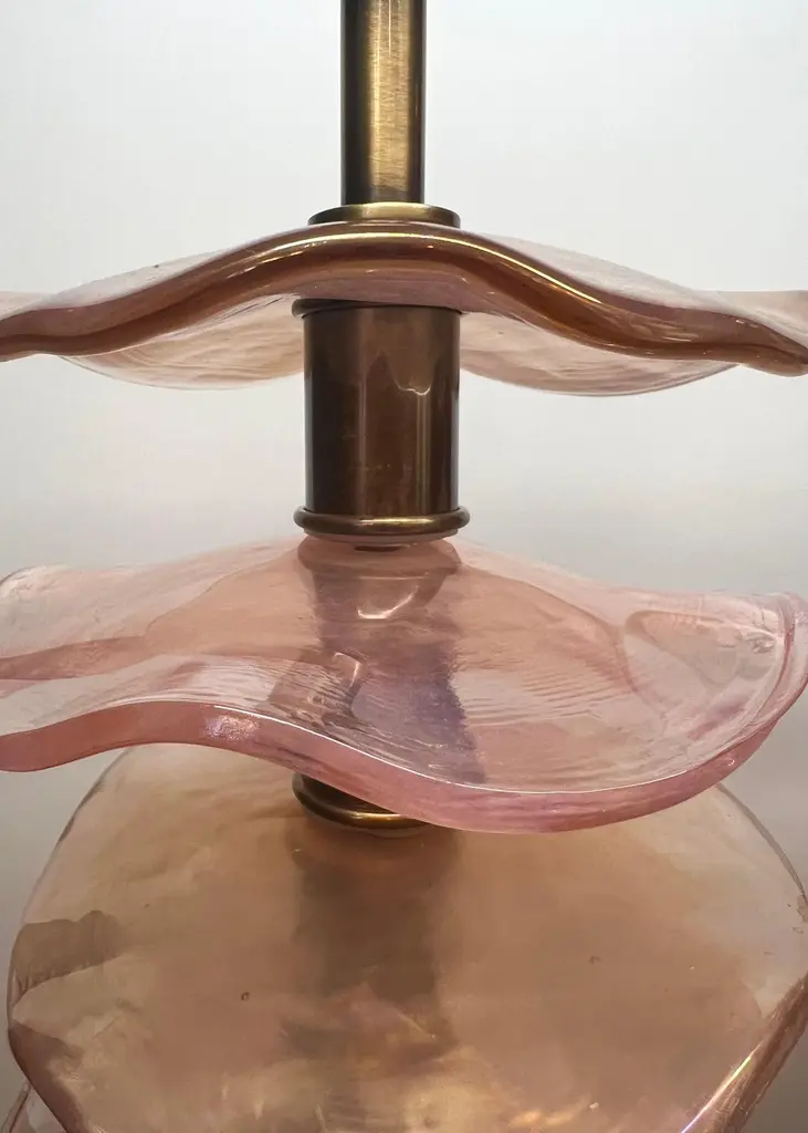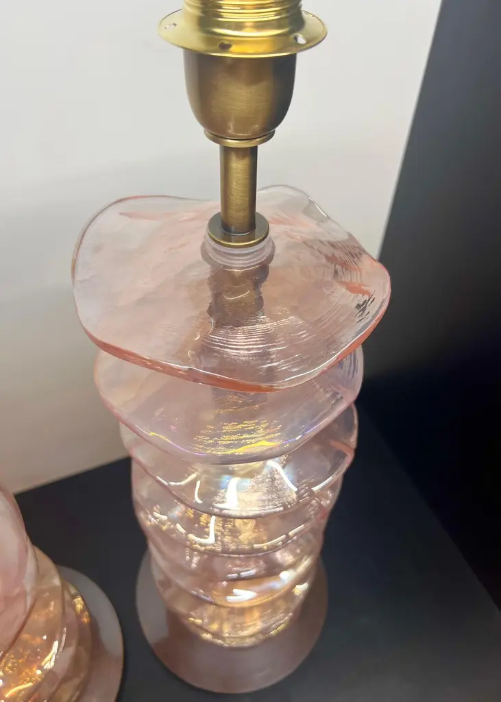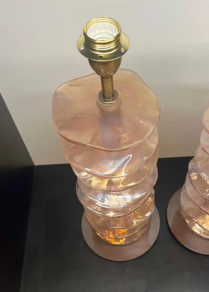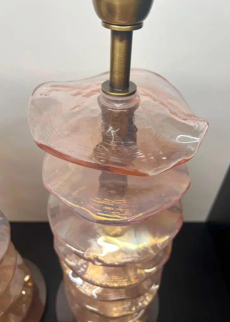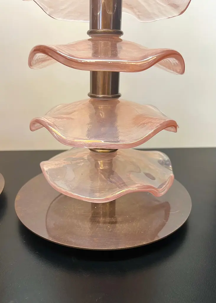 Exclusive pair of Rubin Murano Glass table lamps with satin bronze frame.The lamp has 8 elements of a wavy circular shape in a mirrored ruby colour.Lamp made with great care and precision by our master glassmaker Alberto Donà of Murano.The products are entirely handmade in the Mid-Century Modern style.Project by the master glassmaker of Murano Alberto Donà in 2024.The size of the glass alone is 45cm (17.71 inches).The whole size of the lamp is 56cm (22.04 inches).E26/E27 bulb connection.Complexity is the hallmark of Murano glass lamps. The sheer beauty that radiates into any room is wonderful.The price of the item includes professional and tailor-made packaging.The lamps can be rewired for your country code.