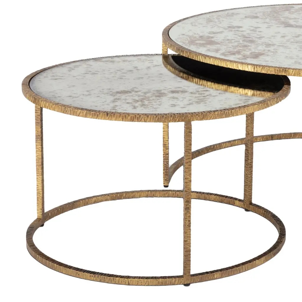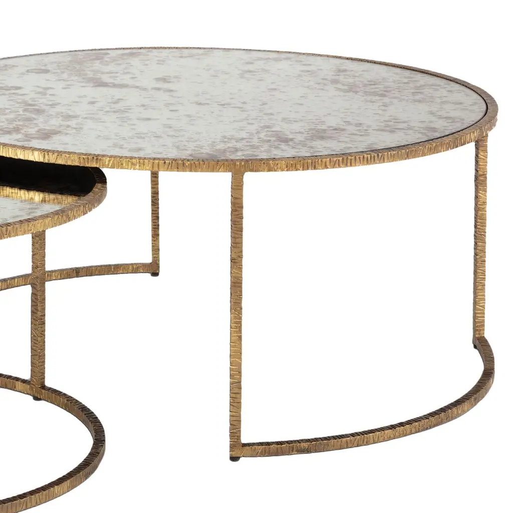 Your living space deserves something special. This cocktail table set is a gorgeous addition, with a hand-textured metal base and a lustrous finish. Its antiqued mirror glass adds a glamorous edge so you can enjoy the distressed details of its alluring intricacy. This piece is a chic accent to any room in your home.