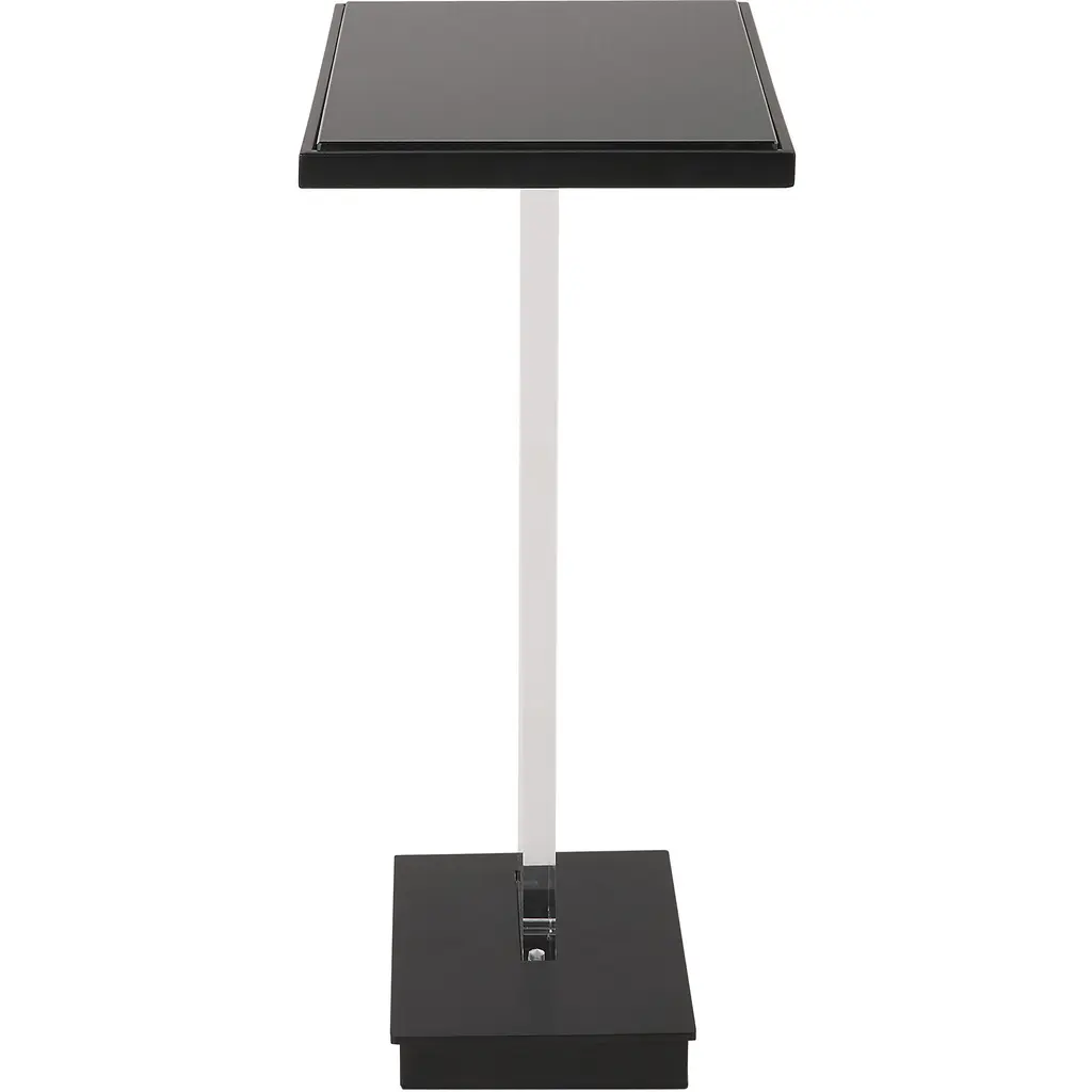 An ode to contemporary styling, our angle accent table showcases a gravity defying design featuring a clear angular support. Top is black mirror with a coordinating black metal base.