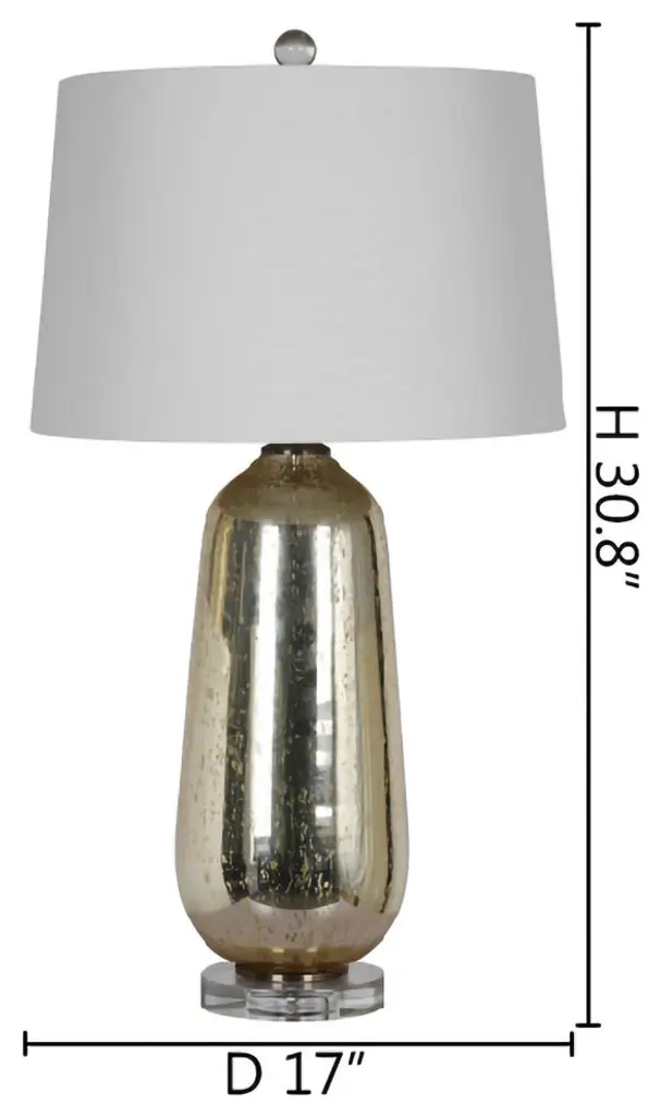 This table lamp features a vintage-inspired design with a gold-toned glass base and a white shade. The distressed finish adds a touch of rustic charm, while the sleek lines and minimalist design create a contemporary look. This lamp is perfect for adding a touch of elegance to a living room, office space or bedroom.Color: Antique GoldSize: D17" H30.8"Materials: MetalLighting Specs:Commercial Use: YesUL Certified: YesETL Certification: NoLight bulbs not includedNumber of Bulbs: 1Bulb Type: E26Max Wattage: 60