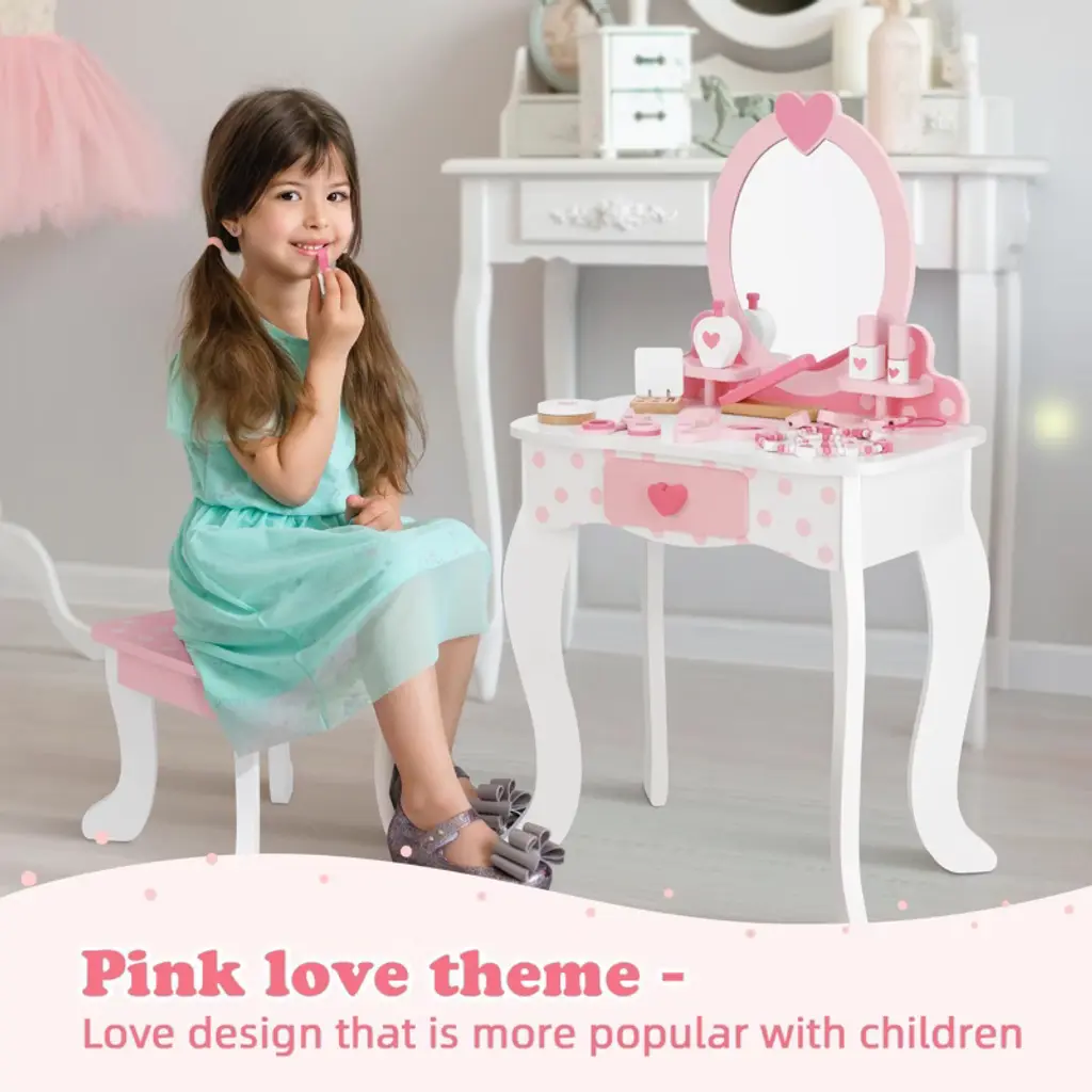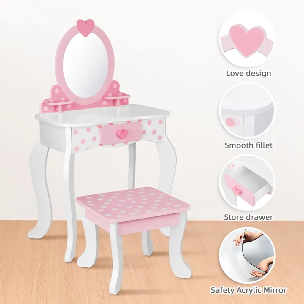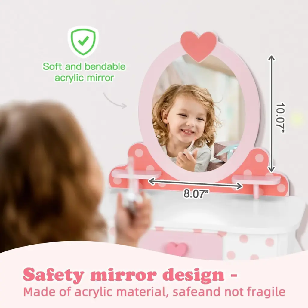 Delight your little one with this adorable vanity set featuring a table, chair, and mirror, complete with 15 fun makeup accessories and a handy storage drawer. Designed with kid-friendly dimensions and sturdy wood construction, it fits perfectly in bedrooms or playrooms while ensuring durability and easy cleaning. Encourage creativity, social skills, and imaginative play—making every day feel magical for your child.