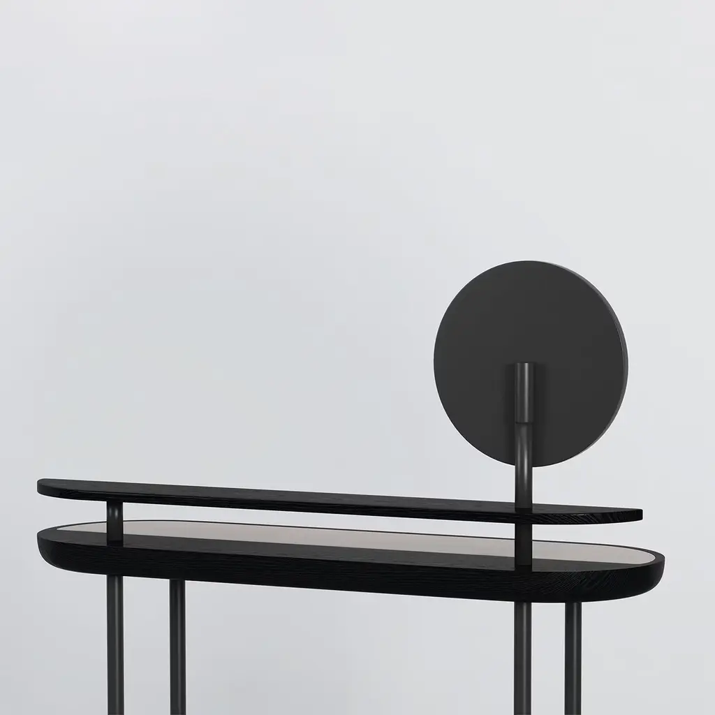 The Apollo Desk by Artefatto Design Studio is an elegant dressing table featuring two levels and a rotating Extra Clear Mirror. It showcases a Dark Stained Walnut wooden top with a Premium Calacatta marble insert, creating a refined contrast. The Jet Black metal lacquered structure complements the soft curves and rounded shapes, adding a sleek, modern touch. Apollo is available in different wood, stone, and upholstery options.