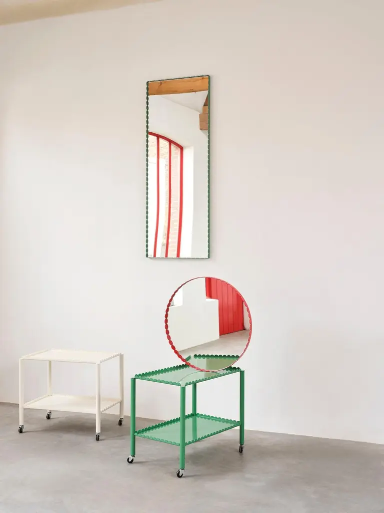 Designed by Belgian duo Muller Van Severen, Arcs Mirror is formed by a unified chain of vertical arcs that encase the mirror to create an elegant, scalloped edge. Made in stainless steel with a mirrored finish and powder coated steel in different colors, its variety of sizes and shapes ranges from a small round mirror to a large rectangular one, making it suitable for all rooms and uses.DesignerMuller Van Severen was founded in 2011 by Belgian artist duo Fien Muller and Hannes Van Severen. The couple has always been on an inspired quest for sculpturally interesting furniture objects, and their work sits somewhere between design and art, drawing on their passion for architecture and materials. They have won countless awards and collaborated with prestigious museums worldwide (such as Vitra Museum, Centre Pompidou and Musée des Arts Décoratifs Paris) and international galleries (Galerie Kreo, Side Gallery, Valerie Traan Gallery). For HAY, Muller Van Severen has designed the Two-Color, Ceramic Table, Color Cabinet, MVS Cutlery, the Arcs Collection, Color Rack, Color Hanger and Arcs Salt & Pepper Grinder.