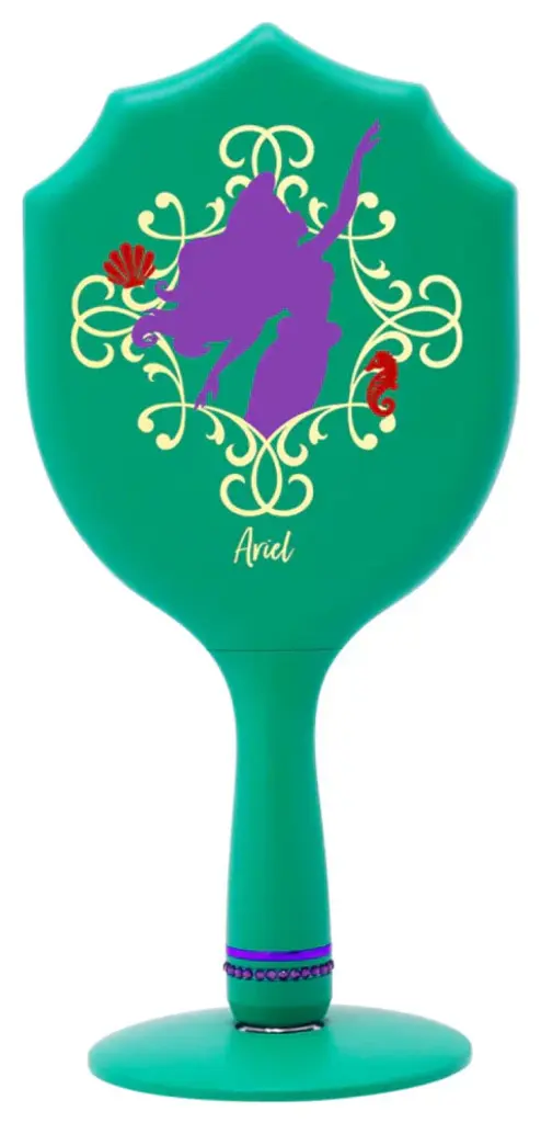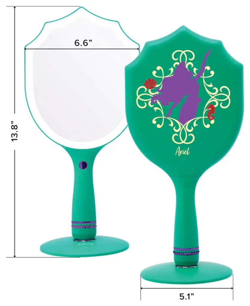 Impressions Vanity This magic mirror is inspired by your favorite Disney Princess, outlined by a bright LED light strip, and powers on with just the click of a shimmering button. Simply press the button to turn on the mirror and press and hold down to adjust the brightness. Includes a magnetic ball standing base to dock the mirror for hands free use. Rechargeable for cordless use. Easy recharging by simply plugging in the provided USB charger to the mirror. Fit for a princessFeatures:ENCHANTED HANDHELD MIRROR: Inspired by our favorite Disney Princess, this magic mirror has a handle for comfortable holding. An Ariel LED hand mirror will be a charming piece in your vanity!LIGHTED MIRROR: This makeup mirror is outlined by a bright LED light strip with three light color temperatures to choose from: cool white to natural or warm light tones. Press and hold the button to adjust the brightness.ADJUSTABLE STANDING BASE: Includes an adjustable magnetic ball standing base to dock the mirror for hands free use and can tilt for the perfect angle. The compact and slim design makes this mirror travel friendly and ideal for storing in your luggage.RECHARGEABLE: Rechargeable for cordless use. Easy recharging by simply plugging in the provided USB charger to the mirror.