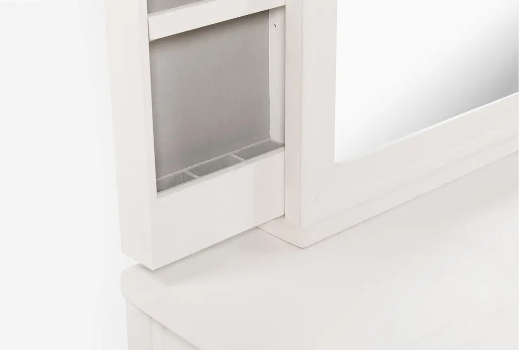 Enhance your bedroom with the Austen White 3-Drawer Bedroom Makeup Vanity Desk & Mirror. This traditional piece is designed to offer both style and functionality, featuring hidden side storage and LED lights for a modern touch. Its white finish and oak veneer blend seamlessly into any decor, making it a versatile addition to your space.