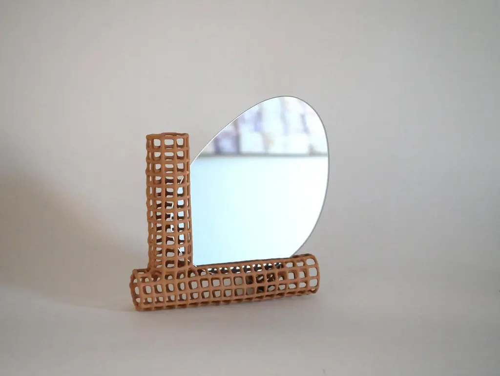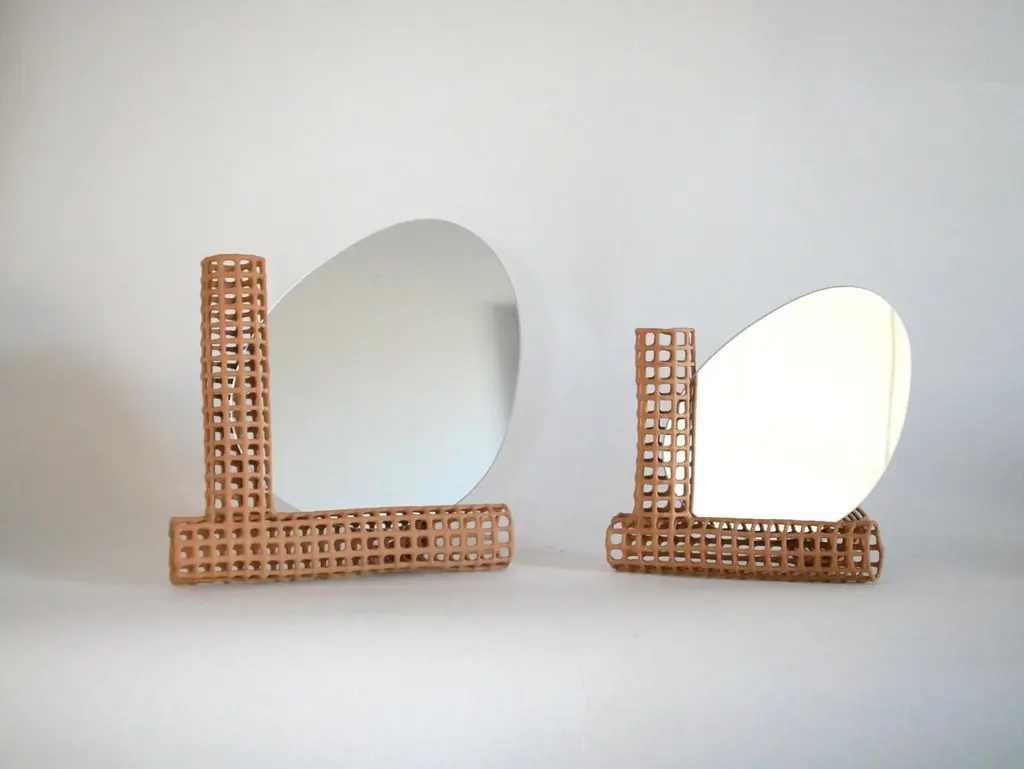 Big Chevalet Table Mirror by Dzovag KotchianDimensions: W 29 x D 13 x H 27 cmMaterials: Stabilized Raw Clay, Metal, Mirror. Dzovag Kotchian's work develops through theoretical reflection and artistic research. Experimentation with materials, uses and manufacturing processes occupies a central place in his projects. Since 2023, he has focused on creating objects in stabilized raw earth using a manufacturing process that he developed over several years. The freedom that his manufacturing technique gives him allows him to create airy and light objects that are sometimes organic and sometimes geometric.
