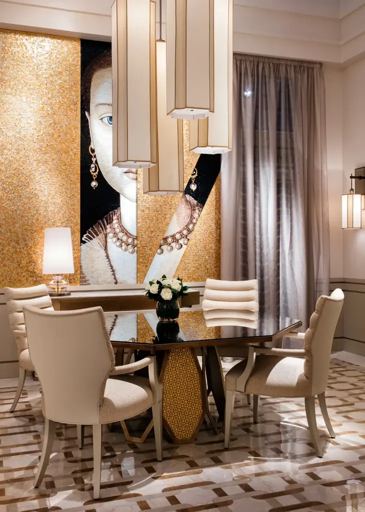 Borgia is a table characterized by sophisticated geometries and fine workmanship. The elegant details elaborated with the help of master craftsmen highlight the quality of the materials and the exclusive design.Structure in metal with optional mosaic inserts. Top in mirror, marble, or liquid metal coating.Collections characterized by elegant and classic lines. The pieces, real works of art, are made entirely by Masters mosaic, leather craftsmen and cabinetmakers. The evolution of this line combines masterful craftsmanship with contemporary design.