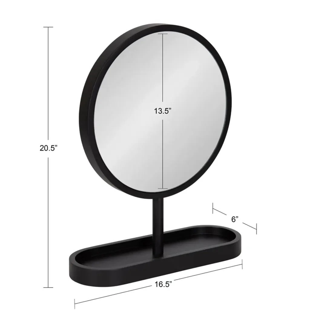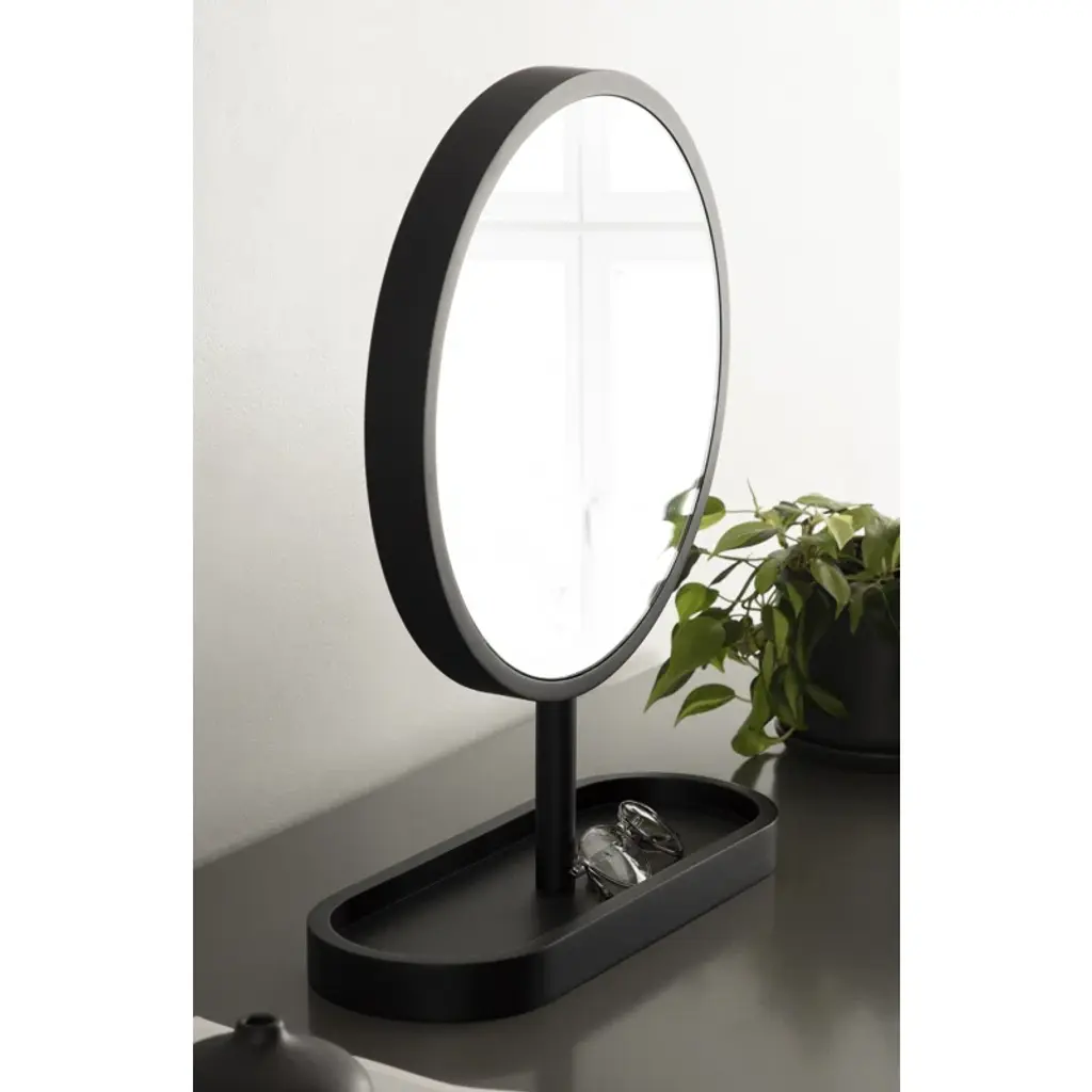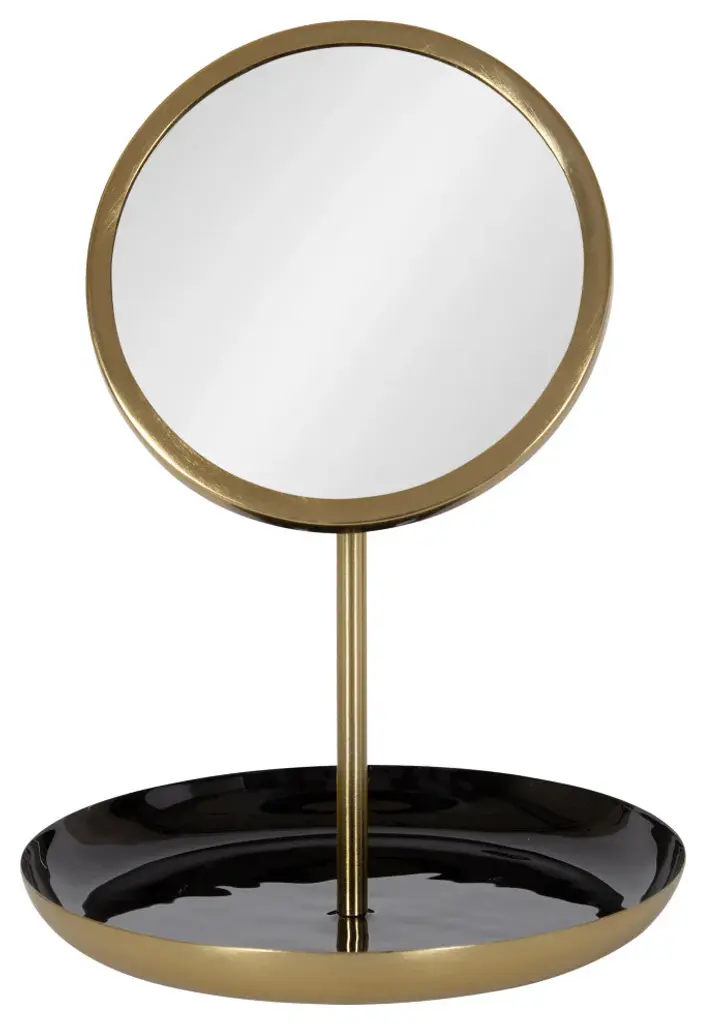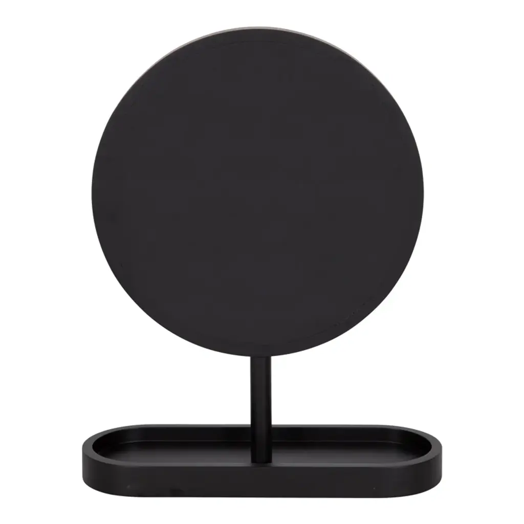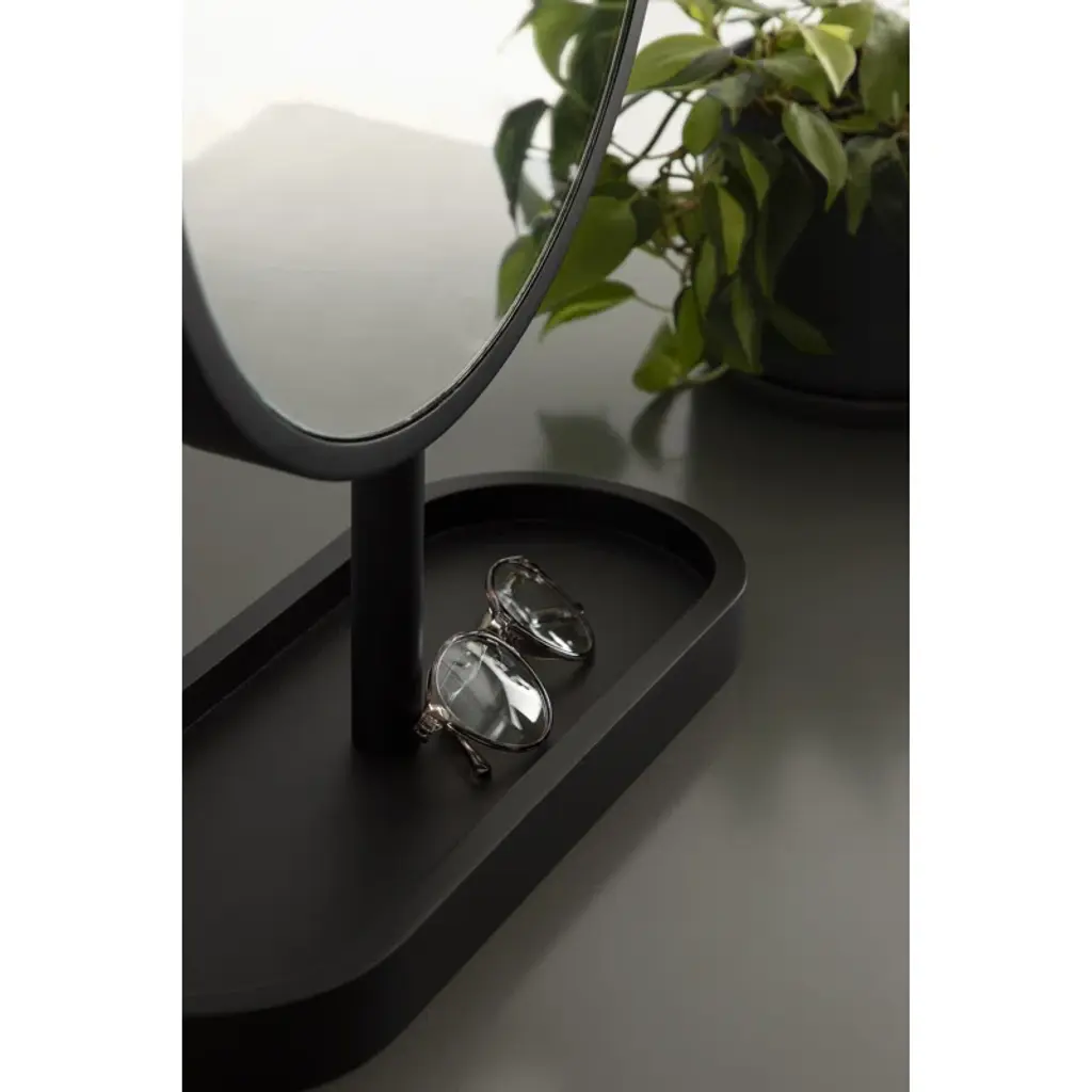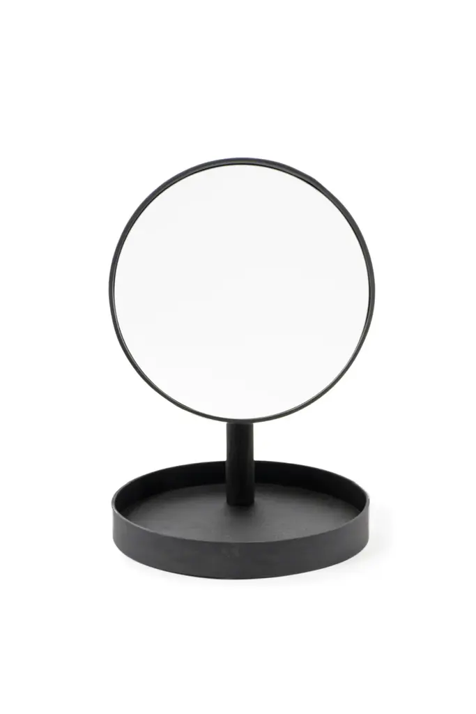 Freshen up. Handcrafted from iron, this tabletop mirror brings a luxe modern look to your dresser or vanity table. It rests in a capsule-shaped tray base that’s ideal for displaying accessories + self-care items. The generous size lets you check out your hair + face all at once – looking good btw.